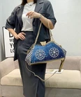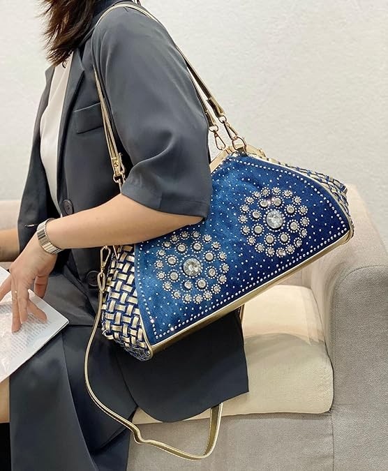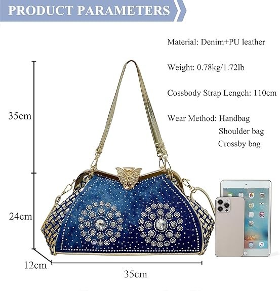 【Material】: Premium denim fabric and PU leather, comfortable, machine washable, ironable, soft to the touch, durable, hand-woven design, luxurious butterfly clasp, adorned with countless sparkling A CLASS rhinestones using eco-friendly adhesive. I believe these highlights will win your favor. 【Dimensions】: 35 cm (L) x 12 cm (W) x 24 cm (H), Handle height: 35 cm (suitable for shoulder carry), Detachable shoulder strap length: 110 cm (long enough for crossbody use), Ideal for daily use. Spacious interior accommodates daily essentials like a folding umbrella, phone, power bank, cosmetics, wallet, etc. 【Weight】: 0.78 kg / 1.72 lbs. A lightweight, portable clutch. Its unique design style makes you the center of attention at any party. 【Versatile Use】: Perfect for daily occasions—parties, travel, work, or shopping. Additionally, the adjustable and removable shoulder strap allows it to function as a handbag, crossbody, or shoulder bag. Effortlessly pairs with any outfit, from dresses to jeans. Fashionable and casual, embodying everything you dream of in a single shoulder tote. An essential piece for women this season.
