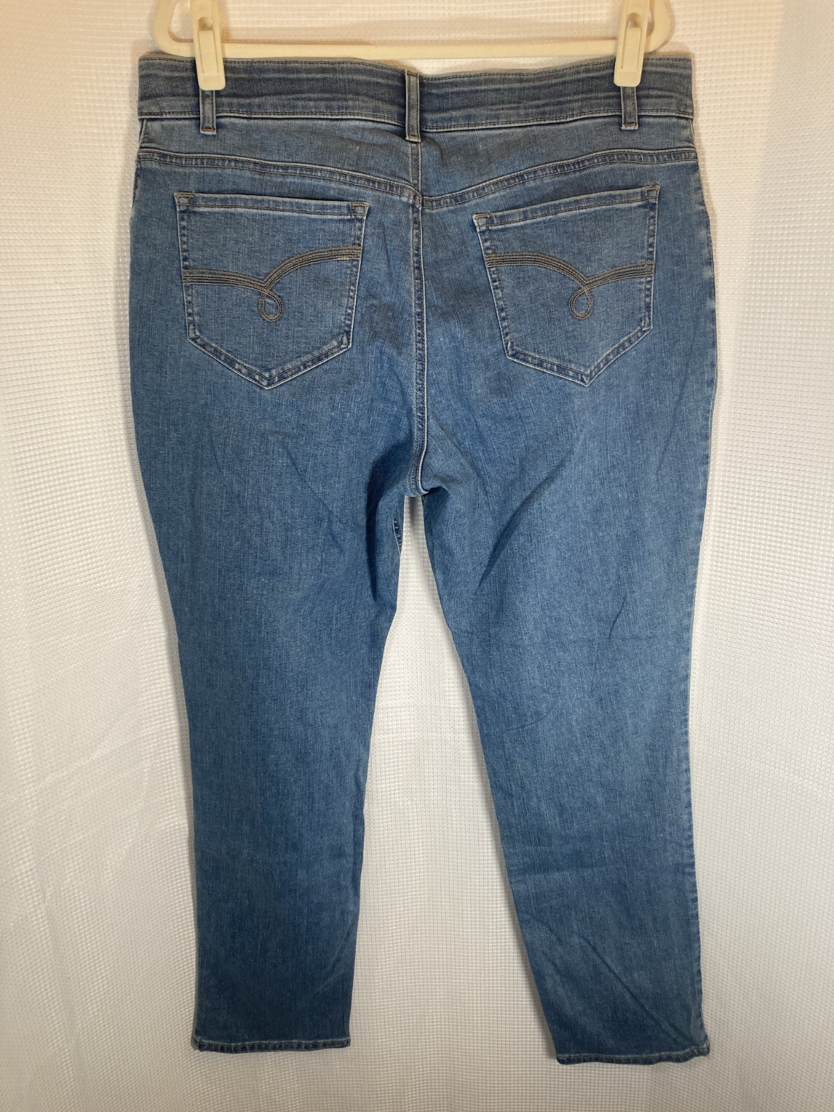 Comfortable and flattering Riders by Lee slim-straight jeans in a classic denim wash. These jeans feature a mid-rise fit with a slim-straight leg that offers a clean, streamlined silhouette. Made with a soft stretch blend (69% cotton, 30% polyester, 1% spandex) for comfortable all-day wear while maintaining shape. Features include: Size 18W (Medium length) Slim-straight leg Mid-rise fit Classic 5-pocket styling Button and zip closure Stretch fabric for comfort and flexibility Light wash with natural fading detail Perfect everyday jeans that pair easily with tees, sweaters, or blouses for casual wear year-round.