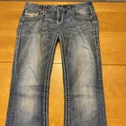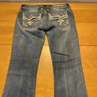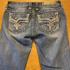 Elevate your denim game with these stunning Rock Revival jeans in size 28. The Betty Bootcut style features a flattering mid-rise fit with a zip and button closure. The jeans are made of a comfortable blend of polyester, viscose, cotton, and elastane that provides a stretchy fit with pockets for added convenience. These are pre owned jeans please look over pictures and measurements