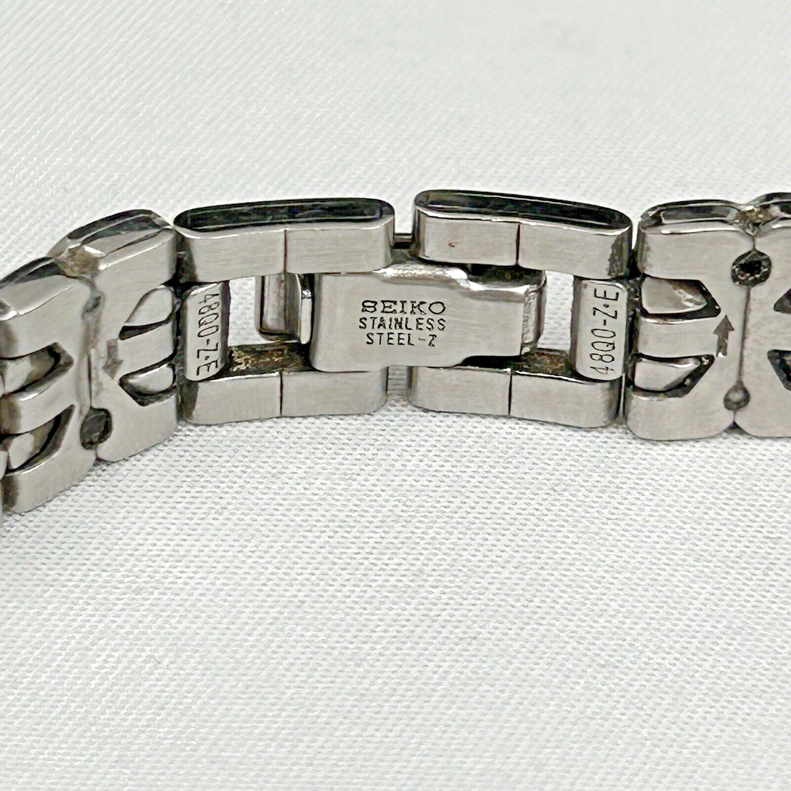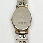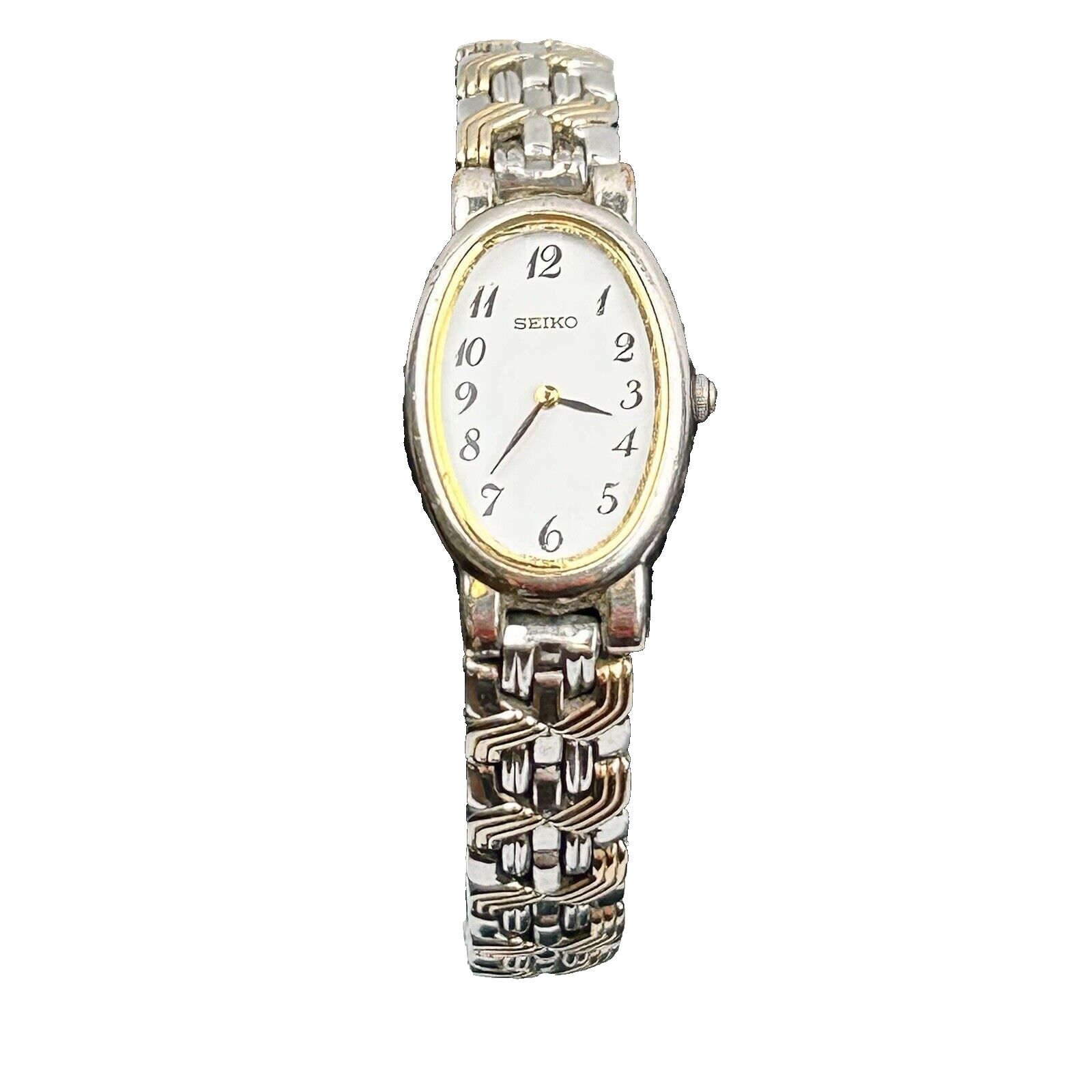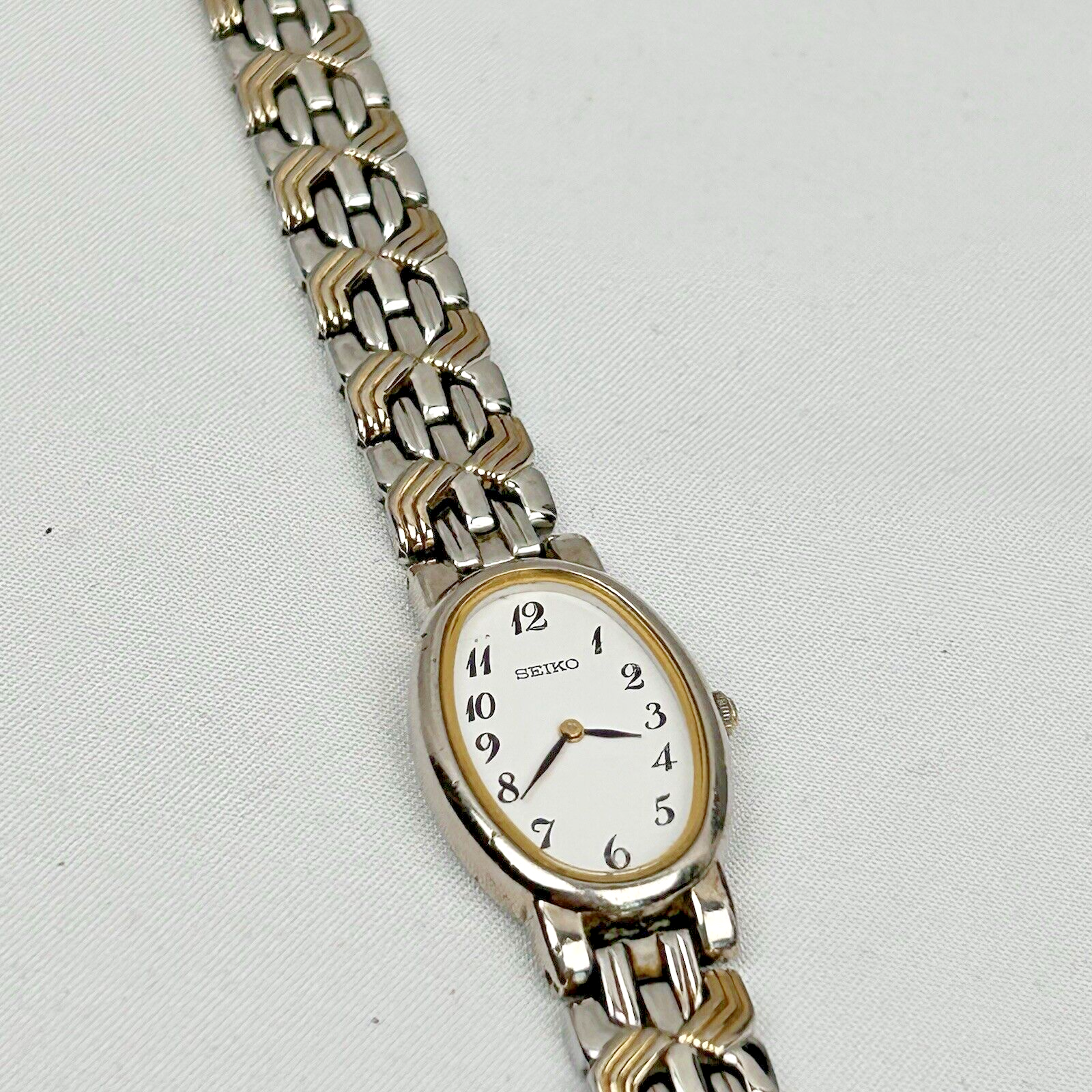 This vintage Women's Seiko Wristwatch has an elegant oval face with a white dial and gold and silver 7.5" chain band. Featuring a 20mm case size and quartz movement, this analog watch is a timeless accessory for any occasion. It is in excellent working condition with a new battery. There are some minor surface scratches and wear due to age, but it still shows very nicely. Add a touch of class to your look with this classic Seiko watch.