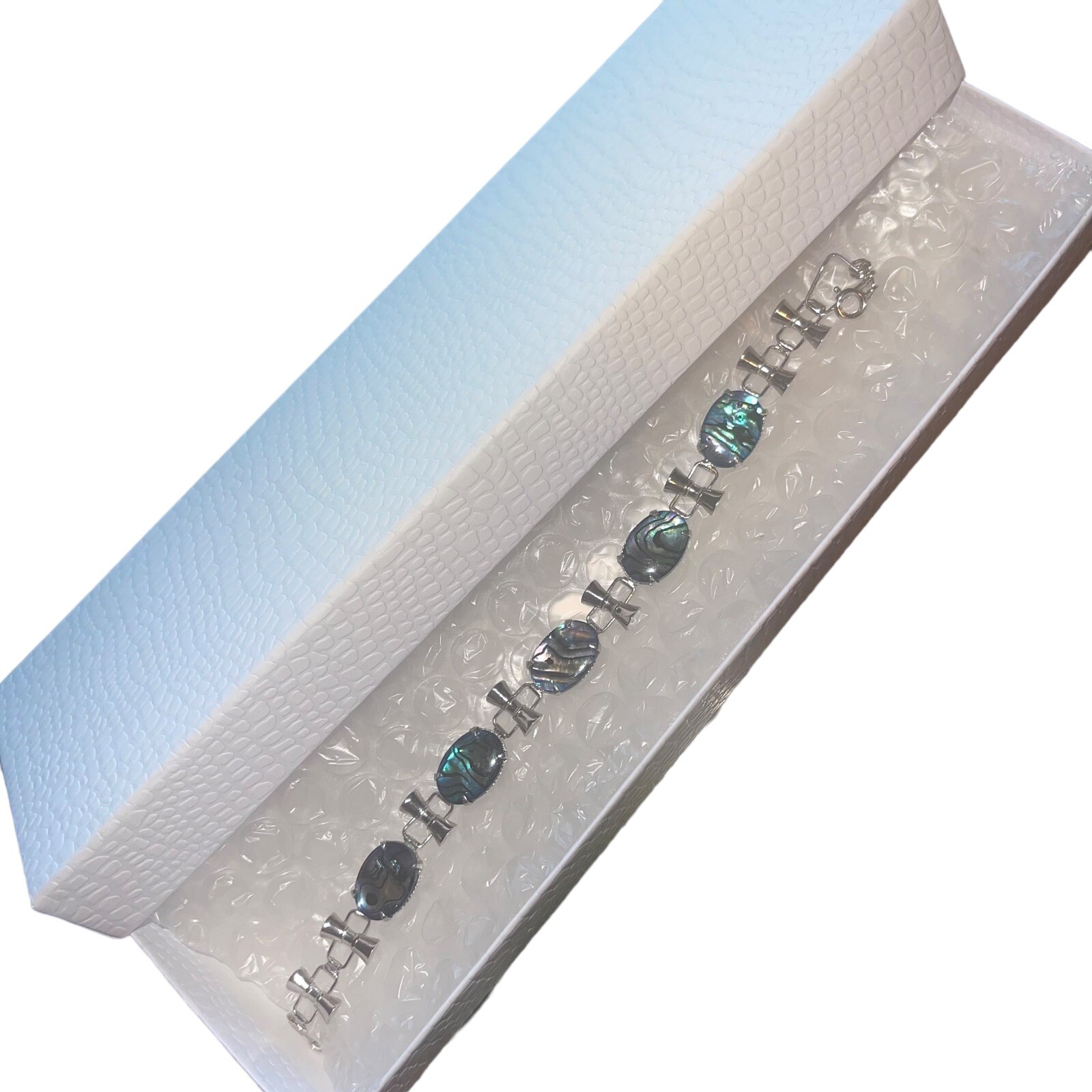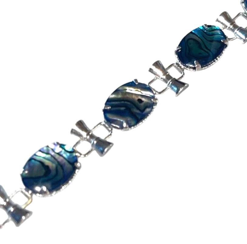 Cool women's silver tone link bracelet. Bracelet features 5 beautiful prong set abalone cabochons. The length is approximately 7.5 inches and it has a 1 inch extension chain and a spring ring clasp. Very pretty bracelet with a unique design. Comes boxed as shown in photos and would make a nice gift. Bracelet is in very good condition and shows no prior wear. See photos. Zoom for more detail and assessment of condition. Feel free to contact me with questions. I can combine shipping and will provide a combined shipping quote upon request. I do my best to be accurate and transparent in the description and photos provided. To preserve the overall condition of each piece, I do not polish or extensively clean items prior to photographing or shipping. Sold as is. All sales are final. Returns are not accepted, however your satisfaction is important to me. Please reach out if there is a problem with your purchase. Thanks! PassionatelyCollected ~I passionately collect things....