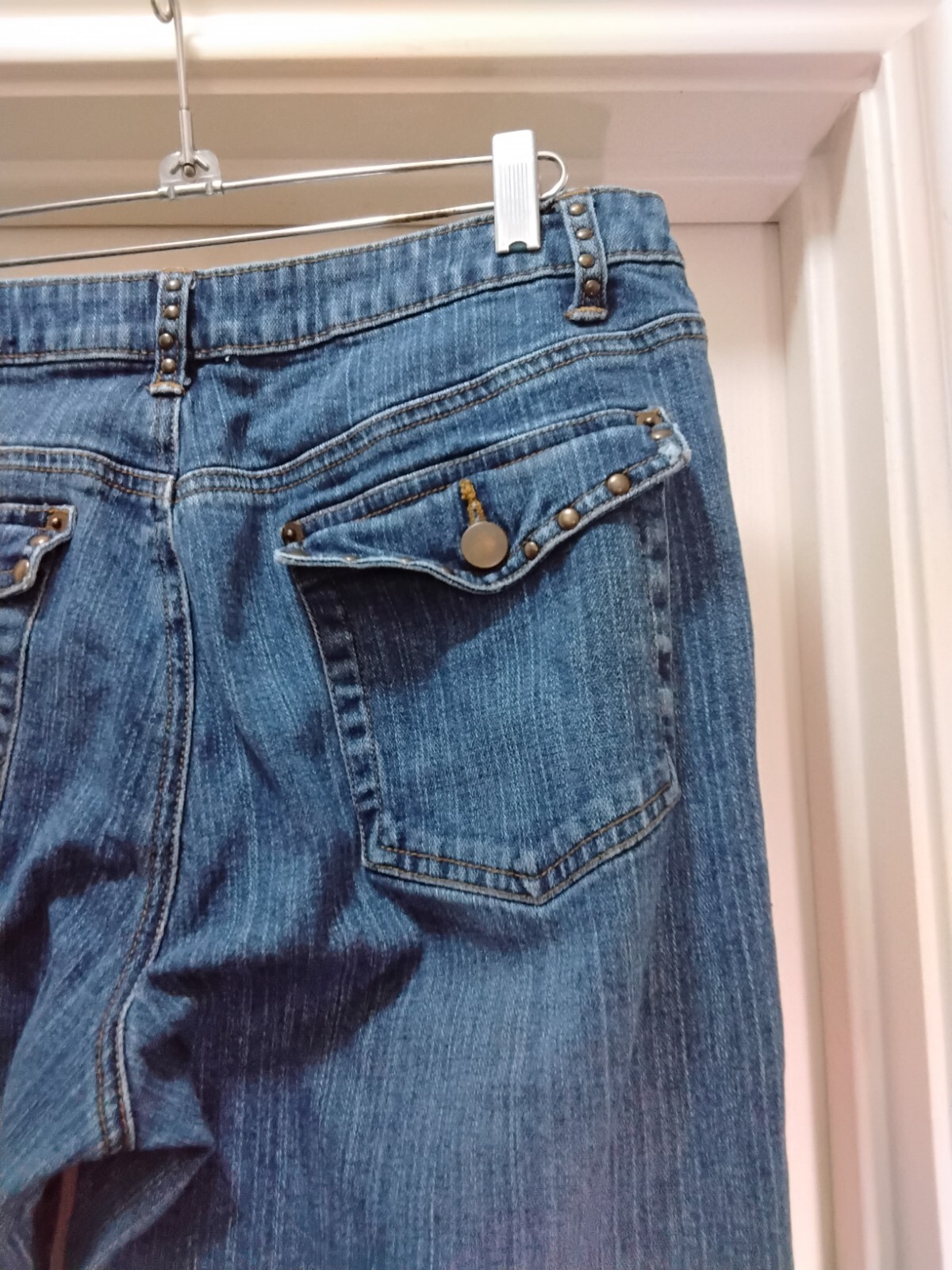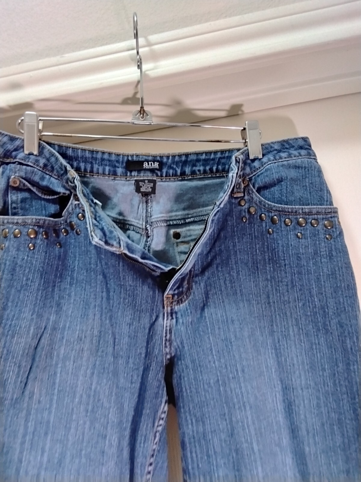 Elevate your style with these stunning blue bootcut jeans from A.n.a. The jeans are made of a comfortable and stretchy cotton-spandex blend, featuring a solid pattern and a medium wash. The studded accents add a touch of glamour to the classic design, making them perfect for any occasion. The jeans have a convenient zip and button closure, with a waist size of 32 inches and an inseam of 32 inches. They are machine washable, ensuring easy care and maintenance. These jeans are a must-have addition to any wardrobe, with their regular fit and flattering bootcut style.