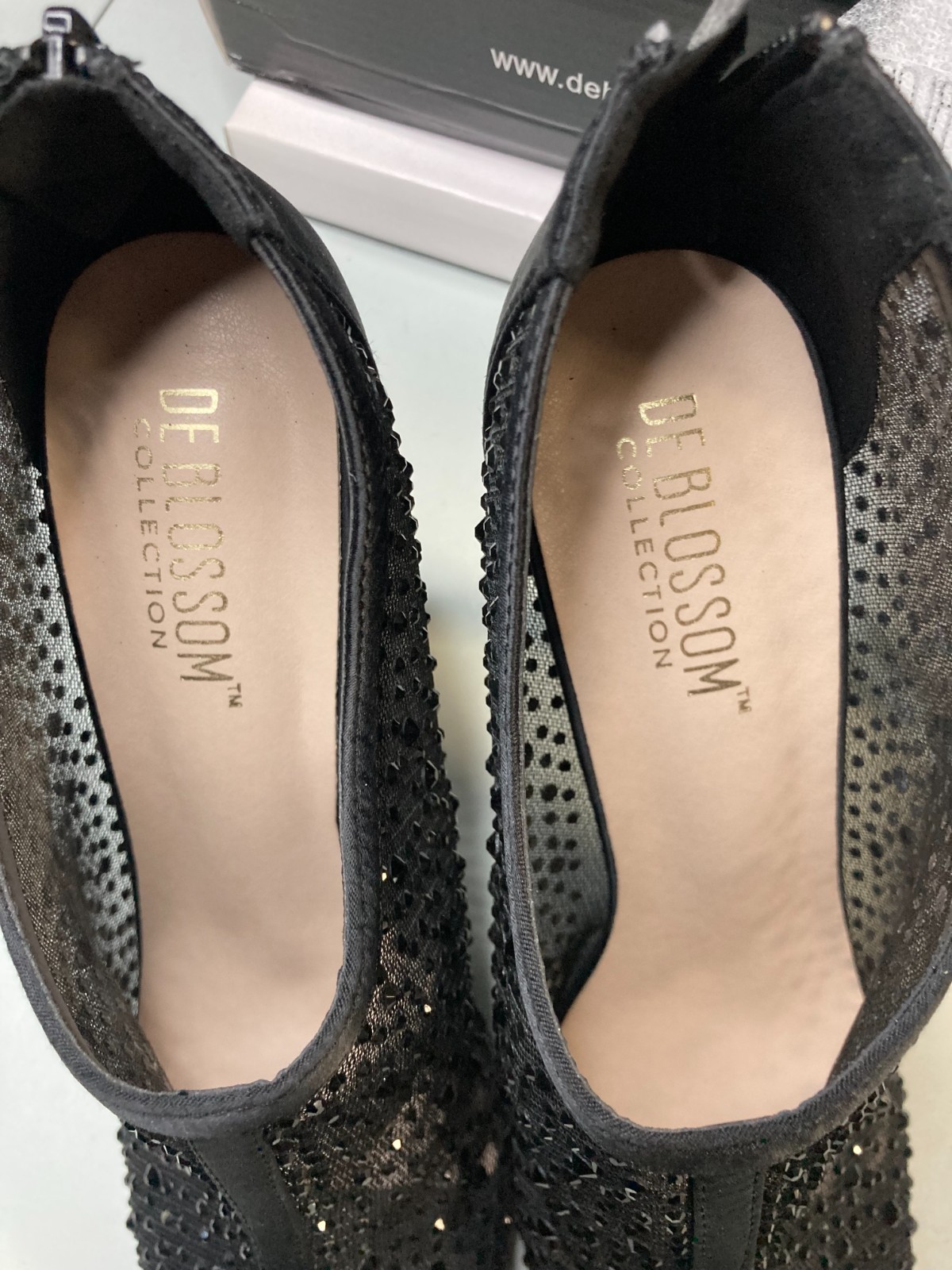 The product is a pair of women's size 8.5 peep toe black jeweled heels from the Blossom Collection. These stiletto heels feature a high heel style, synthetic upper material, and a pump style design. The shoes are new and in nice condition, making them a stylish and elegant footwear option for any occasion.