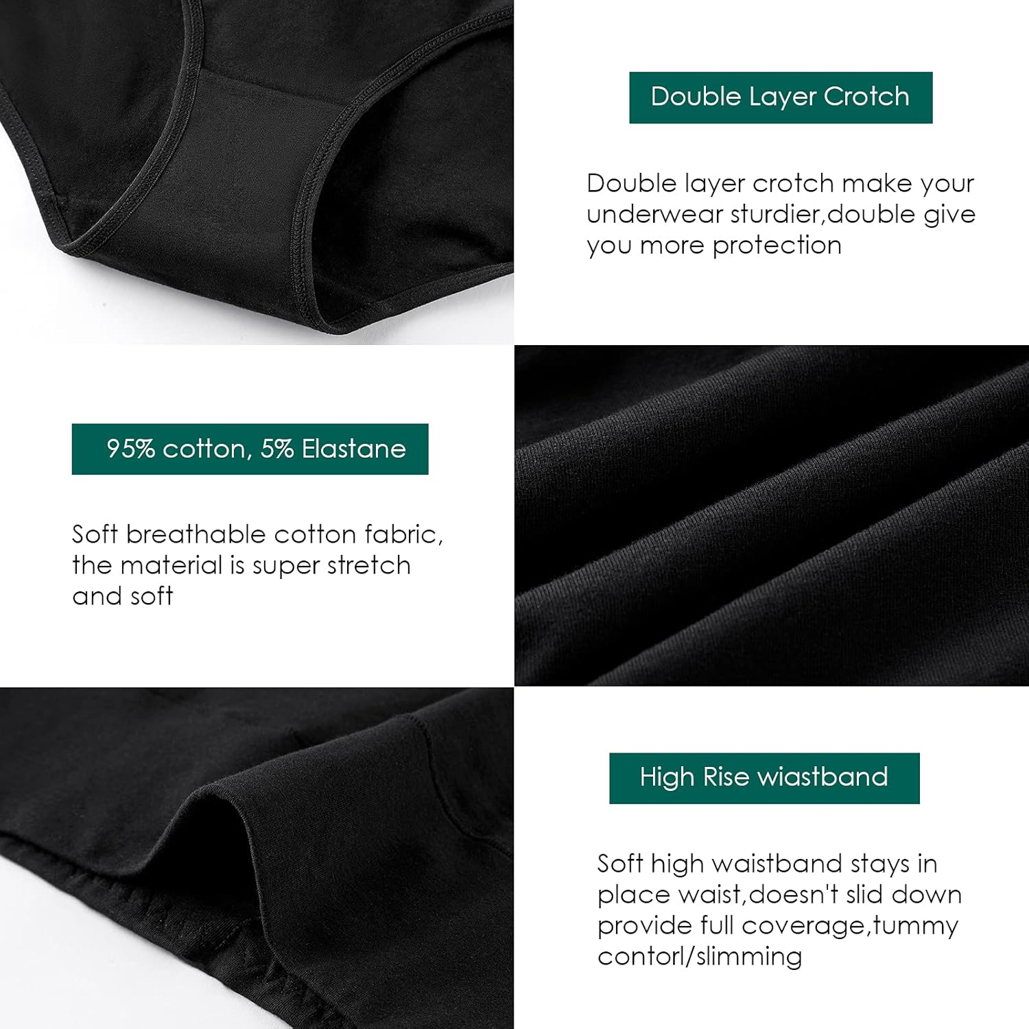 Product Description High wasit tummy control panties for women Designed for daily wear or pregnancy. Waistband that won't roll, bunch, or pinch. Cool Cotton fabric for extra freshness and breathability. Model is 5'7", Waist: 24.4'', Hip: 36.2'', wearing size Small. Stretchy and wicking moisture well; Not see-through;big in the leg openings Product Details Fabric Material: 95% Cotton 5% Spandex; Machine wash cold. Tumble dry low. Underwear Style: High waisted full coverage briefs Good Design: Double layer crotch and double layer waist band True to Size: True US size, Stretchy briefs are full coverage Reguar and Plus Size: Small-5X-Large are available If you are a female, mother or grandma, this high waist panties suits you best Best for Postpartum&C-section Mom Best for after belly surgery, c-sections recovery and post delivery mom, high wasit offers moderate tummy support, help your recovery Plus Size High Waist underwear for women They're plus size-friendly, 3XL,4XL,5XL available. The high waist underwear is made if cotton, it is super comfy and healthy, I promise, you will like it. Offer Moderate Tummy Support The high waist panites offer moderate tummy support, reduces the appearance of muffin top, you will look slimmer and more beautiful. Comfy Stretchy Cotton Fabric These comfy briefs are made of 95% natural cotton and 5% spandex. Premium cotton and spandex provides good comfort and stretchy, Double-Layer Crotch Double-Layer crotch design protect you better, tosomeextent, can absorb some liquid, avoid unexpected messy stains on sheets or clothes High Rise Underwear High rise underwear offer moderate tummy control, no muffin top belly. It never roll down and stay the place Full Coverage Cut Leg This brief-cut style follows the natural curve of the leg to move with your body, lays flat against your skin to prevent panty lines