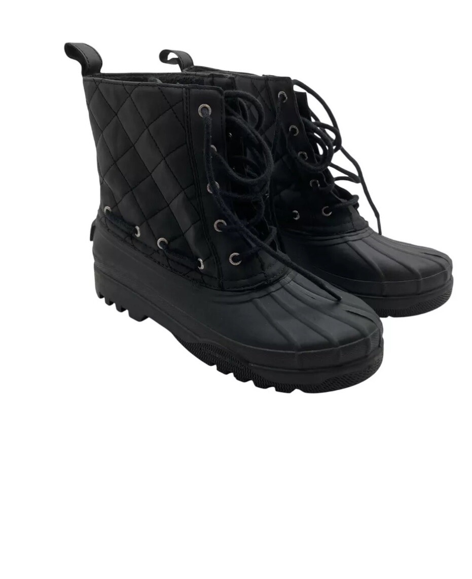The Sperry Top-Sider Women's Waterproof Rubber Quilted Boots in size 8 are designed to keep you stylish and dry in wet weather conditions. The black boots feature a waterproof rubber and fabric upper material with quilted accents for added style. Perfect for rainy days, these rain boots are part of the Top Sider product line by Sperry, known for their quality and durability in footwear for women.