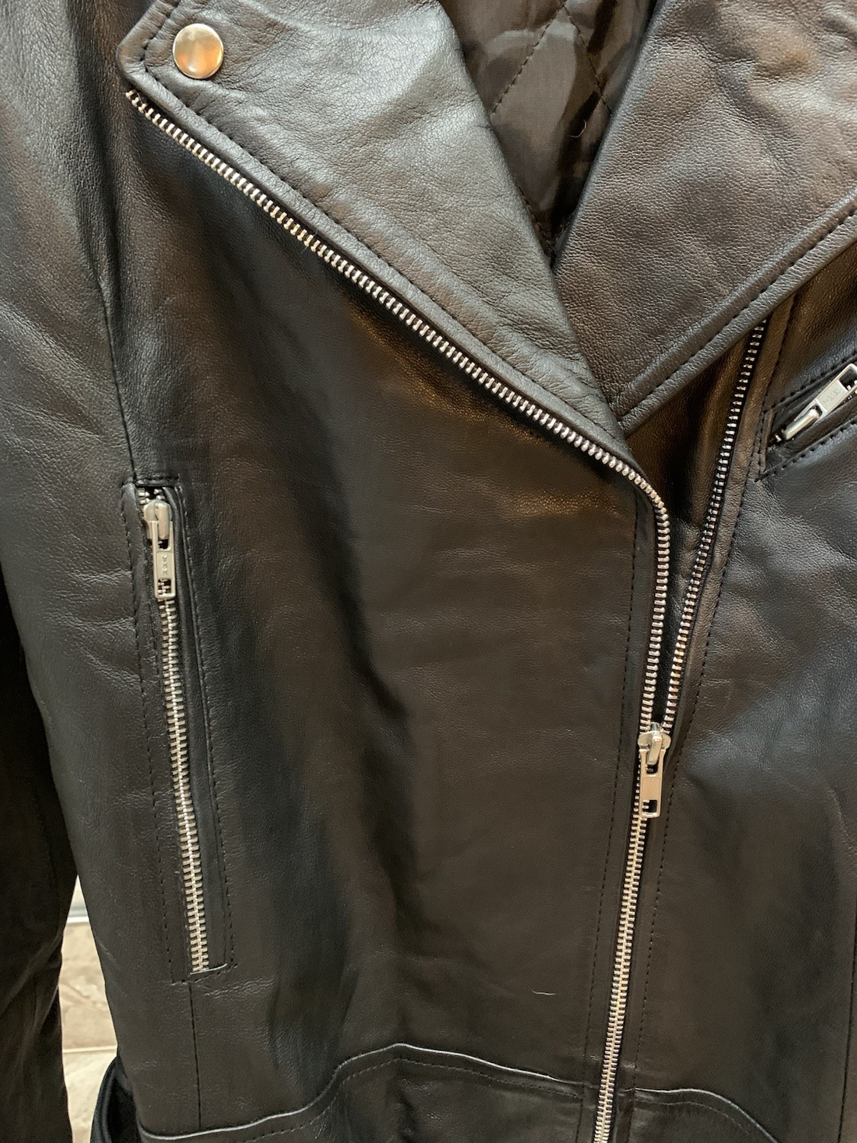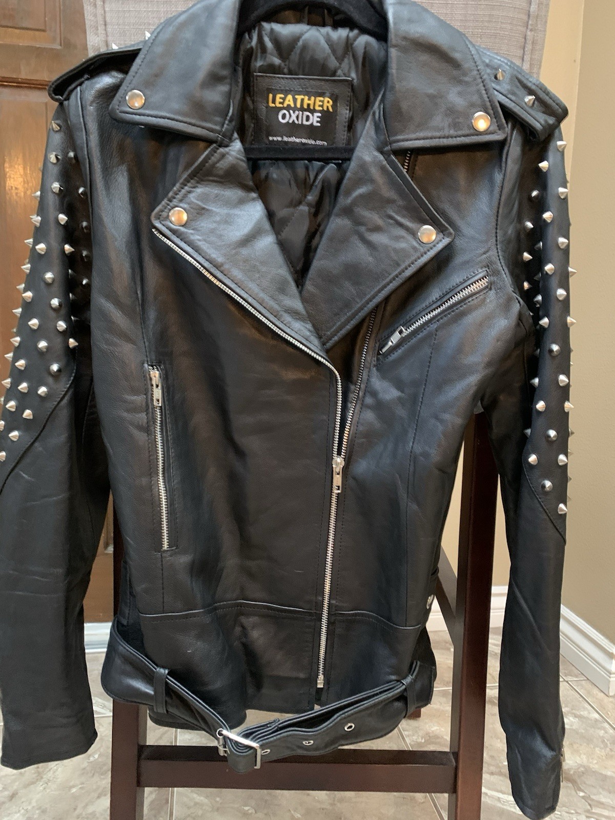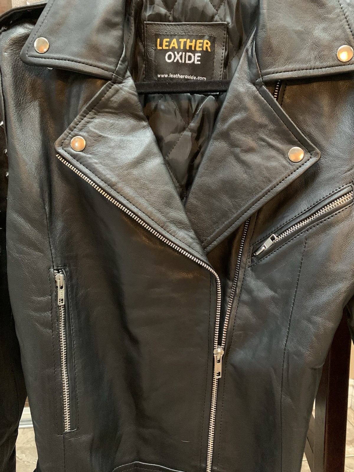 This women's studded leather jacket is made from genuine lambskin leather in a stylish black color. It features a spread collar, long sleeves, and original Ykk metal zips for closure. The jacket is perfect for various occasions such as travel, parties, casual wear, formal events, work, and business meetings. With a belted and buckled design, this motorcycle-style jacket also includes inner pockets, premium stitching, and a durable construction. Handcrafted with attention to detail, this lightweight jacket is lined with polyester and suitable for all seasons, making it a versatile and fashionable addition to any wardrobe. Length 25”