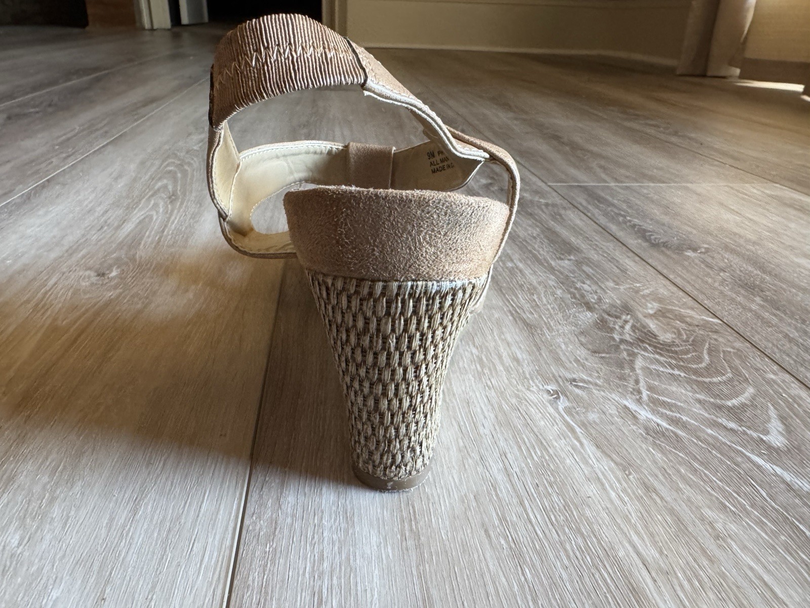 These Women’s Tan Leather Wedge Sandals by Aerosoles are stylish and versatile for casual occasions during the summer and spring seasons. With a high wedge heel and solid tan color, these sandals are perfect for adding a touch of sophistication to your outfit. Made with leather and a comfortable shoe width, these Aerosoles A2 sandals are a fashionable choice for any woman looking to elevate her shoe collection. 3.5” wedge heel