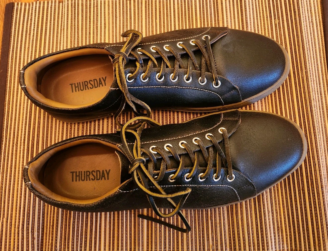 These premium leather low top sneakers from the Thursday Boot Company have espresso brown leather uppers with rawhide laces and durable outsoles. These have been worn once outside, briefly, so they remain uncreased and will break in beautifully with wear. Size 12 medium width, designed for fashion-forward folks who appreciate high-quality footwear.
