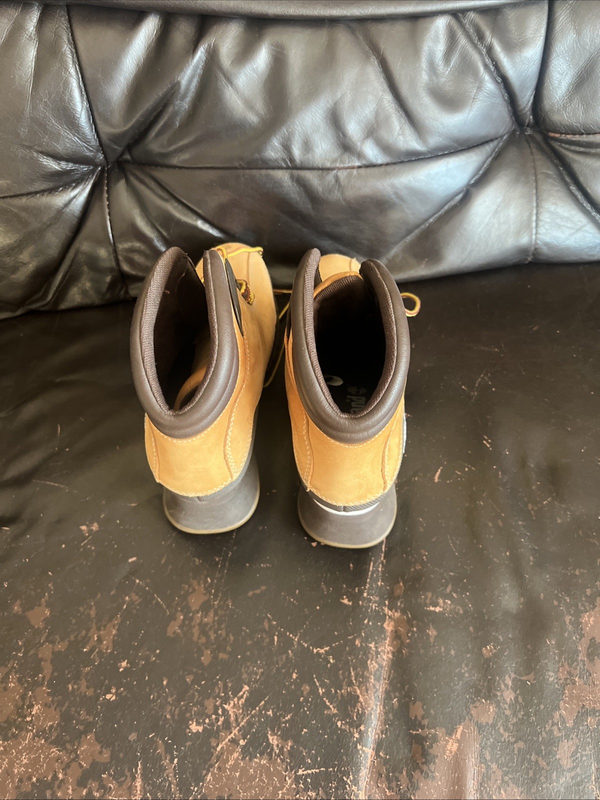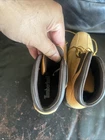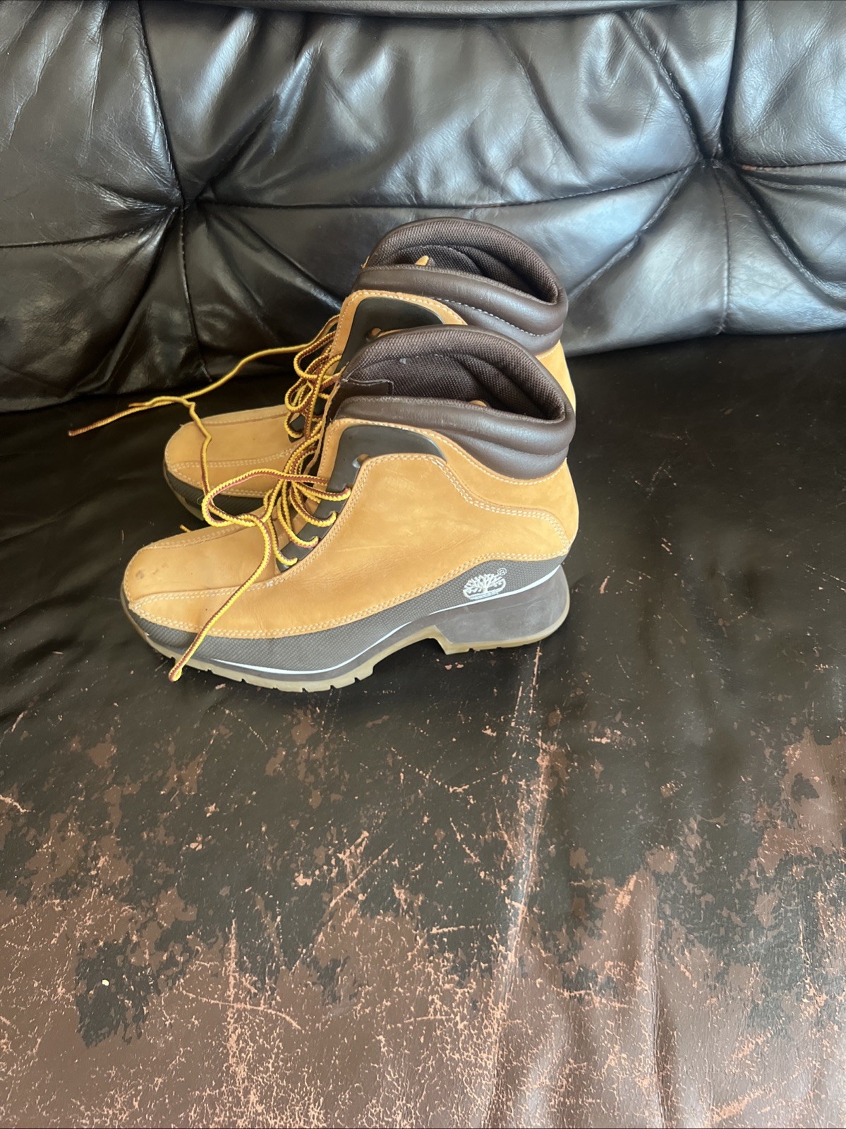 Women size 5 Timberland heeled boots, booty style, buckwheat and color, actual shoes and condition I seen what you see is what you get.