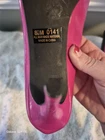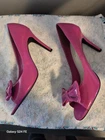 These are like new These are women's Versona peep toe heels in pink with a bow accent. They have a slip-on closure and a stiletto heel style. The upper material is polyurethane and the heel height is mid (2-2.9 inches). These shoes are suitable for party, cocktail, or business occasions, and they are available in size 8.5M. The toe shape is peep toe and the season is summer and spring