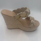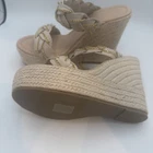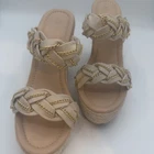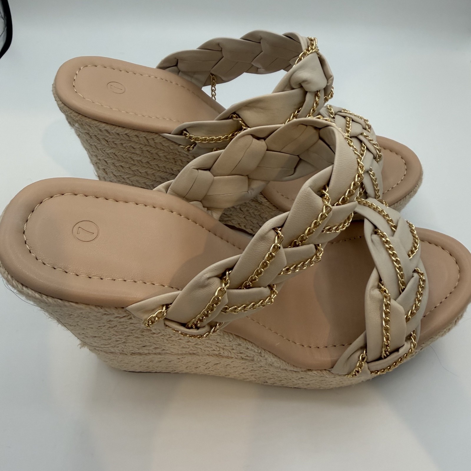 Women’s wedge sandals, size 7 , in a neutral beige/nude color. Condition: New without box Never worn No box included No brand / unbranded Details: Women’s size 7 Slip-on wedge sandals Braided synthetic straps with gold-tone chain detail Espadrille-style platform wedge Open toe design Neutral beige color, easy to match Synthetic / faux leather upper Synthetic insole and outsole These sandals are new and in excellent condition. Please review all photos for exact details and appearance. Ships fast and securely packaged.