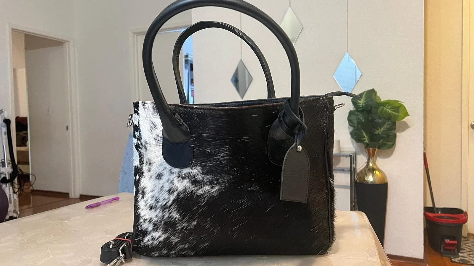 Women’s Western Cowhide Leather Tote Bag Hair-On Hide Purse • Black, Brown & White Women’s Western Cowhide Leather Tote Bag crafted from genuine hair-on cowhide leather, featuring natural black, brown, and white patterns. Each bag is one of a kind , showcasing unique markings that highlight its authentic western style. Designed for both fashion and function, this spacious tote is perfect for everyday use, travel, work, or casual outings. The durable leather construction ensures long-lasting wear while maintaining a stylish, rugged look. Key Features Genuine hair-on cowhide leather Western-inspired design Natural black, brown, and white hide pattern Spacious interior for daily essentials Strong handles for comfortable carrying Durable and long-lasting craftsmanship Product Details Material: Genuine Cowhide Leather (Hair-On) Style: Western / Casual Color: Black, Brown & White (Natural Variation) Gender: Women Condition: New / Handmade Please Note Due to the natural characteristics of cowhide, each bag will vary slightly in color and pattern, making every piece truly unique. Shipping & Handling Fast and secure shipping Ships within 1 business day Carefully packaged for safe delivery