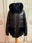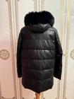 This women's insulated jacket is made of genuine leather and fur, with a mid-length design and a solid black color. The size 54 regular fit ensures a comfortable and stylish winter outerwear option for women.
