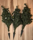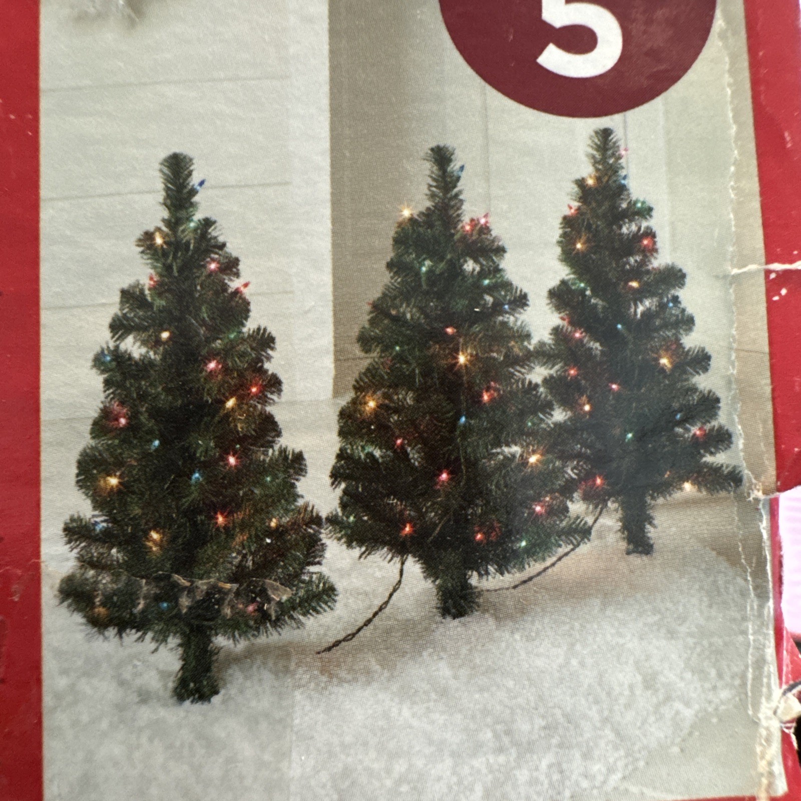 I opened box to test and inspected. Wondershop at Target Alberta Spruce Pathway Lit Tree Set. The set includes three artificial trees, each 2 feet tall x 14.5” wide Each tree has 70 tips and 35 multicolor mini lights. Features include preattached branches for easy setup, plastic ground stakes, and flame-resistant material. The product is suitable for both indoor and outdoor use.