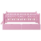 Wood Twin Size Platform Bed Frame with Guardrail 2 Drawers For Kids Girls Pink Features [Semi-enclosed fence] The bed is surrounded by fences, but there is a small opening on the side of the fence, so it is not a completely enclosed space. Children can enter and exit freely through this small opening. [No Box Spring Required] The bed is close to the ground and increase the service life. [Sturdy Construction] Constructed of solid pine wood+MDF, this platform bed features a sturdy high quality solid wood construction for durability and high load capacity, ensuring longevity. [Easy to Assemble] All parts included in your package are indicated clearly. With step-by-step installation manual and per-drilled holes, you can easily assemble this bed individually. [Multiple Storage] Comes with 2 drawers, this platform bed is great for storing your clothes, toys or books. Descriptions Wood Twin Size Platform Bed with Guardrail and 2 Drawers, Pink This bed provides your child with an enclosed play area, perfect for exploring their imagination.The design of the guardrail provides safe guarantee.Constructed of solid pine wood+MDF, this platform bed features a sturdy high quality solid wood construction for durability and high load capacity, ensuring longevity. This daybed comes with 2 Drawers, easy to pull out, and a multi-functional piece of furniture ideal for small living spaces. Description Material Pine Wood+MDF Size Twin Color Pink Numbers of Package 1 Spring Box No need Assembly Required Yes Origin Vietnam Dimensions Overall Product Dimension 77.6''L x 41.6''W x 28''H Twin Bed 75.6'' x 39.3'' Total Height 28'' Recommend Mattress Thickness of Bed 6-8'' Overall Product Weight 84.4lbs Weight Capacity 400lbs