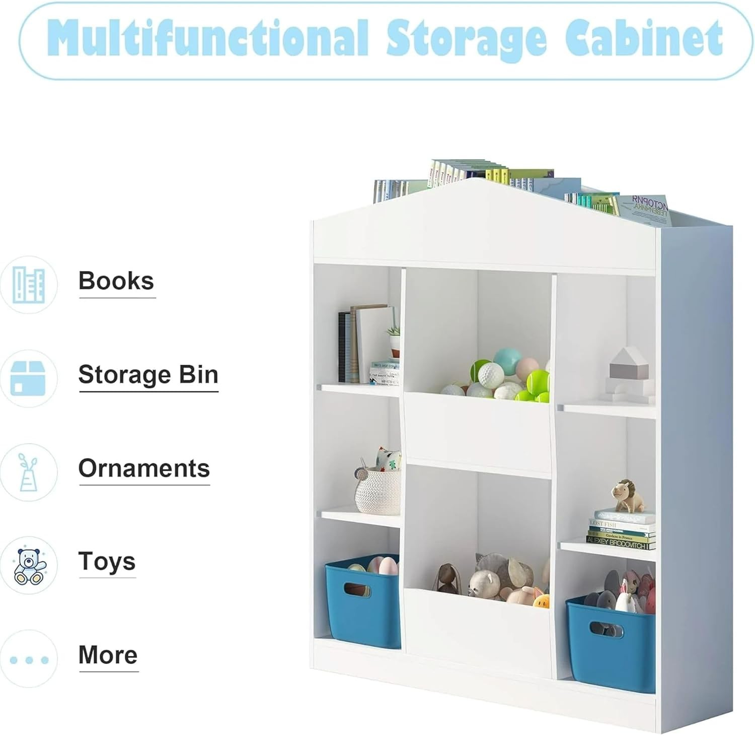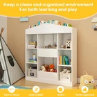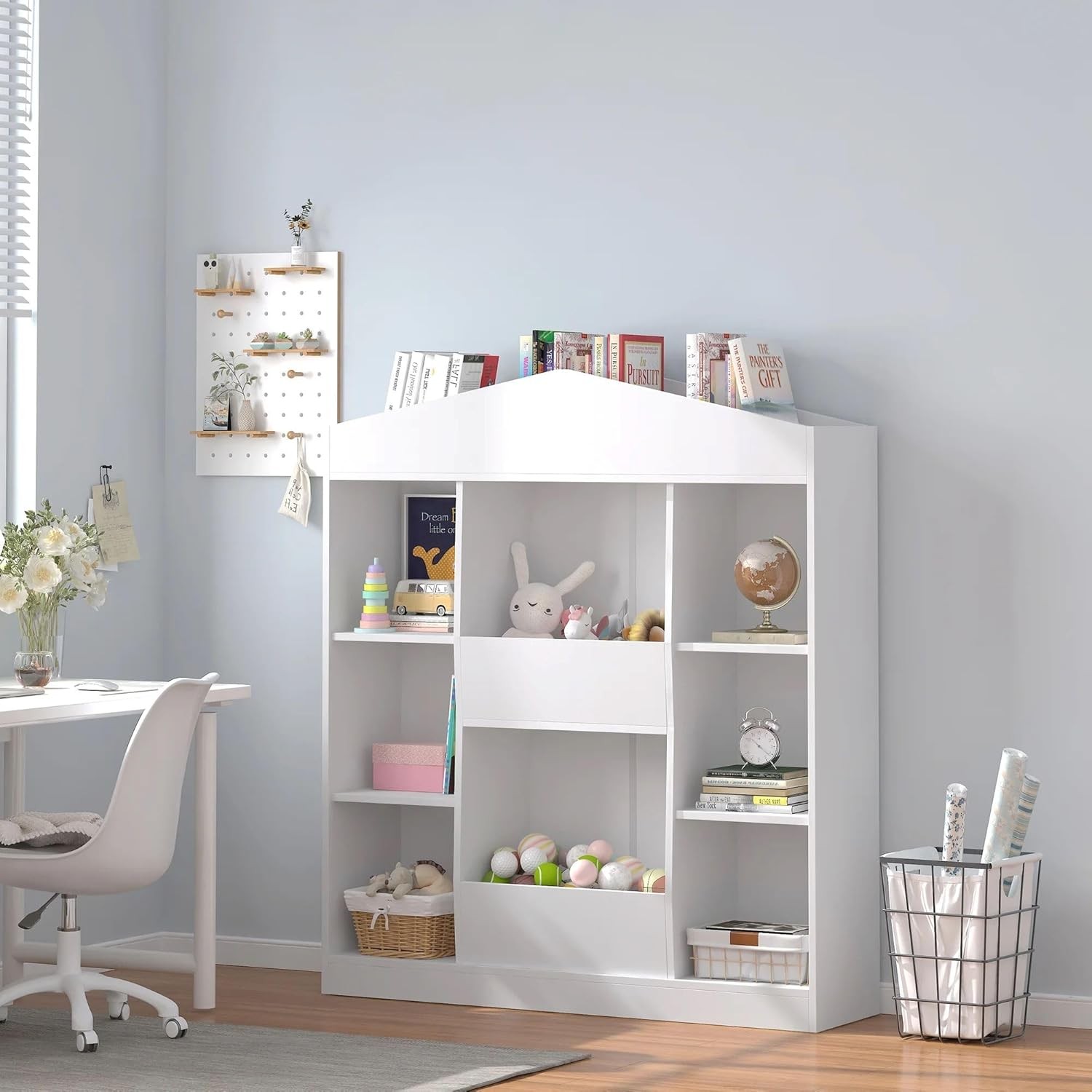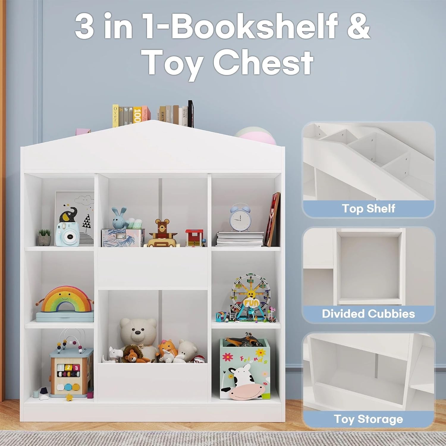Product Description About this item Unique Castle-shaped Design: This kids bookshelf and toy storage organizer offers a charming and playful touch to your child’s room. Its castle-like appearance sparks young imaginations, full of Children's naiveness and fun, making it a fantastic gift choice for little ones that aids in good organization and reading habits Spacious Open Storage Space: Designed with 12 open storage cubbies, this wooden dollhouse bookcase provides ample room for books, toys, dolls and decorations. The open design and child-friendly height allow kids to easily access things, while the elevated bottom keep items from dust Versatile and Functional: Combining white colors, our castle kids' bookcases offers both aesthetics and functionality.Bookshelf for nursery, bedrooms, classrooms, living rooms, libraries, playrooms, and more. With ample storage space, you can store books, picture books, building blocks, toy cars, dolls, souvenirs, art supplies, and much more Enhanced Safety: The bottom of the castle toy storage organizer is stable and resistant to tipping over, and we also provide two anti-tipping devices for added safety, ensuring your child's well-being. Made from high-quality MDF materials, our kids bookshelf is odorless and healthier. Moreover, the anti-falling baffle add to the overall security Easy Maintenance and Assembly: The scratch-resistant and waterproof surface makes cleaning a breeze—simply wipe with a damp cloth to keep it looking new. Additionally, Our kids bookcase and toy storage comes with clear and concise installation instructions, with each product labeled with corresponding numbers for easy assembly. Dimensions of the bookshelf : 12"D x 42"W x 47"H Real Customer Pictures and Ideas I'm absolutely loving my castle bookshelf! It's incredibly sturdy and well - crafted. The design is unique and perfect for showcasing my books. The finish is smooth and elegant. It arrived quickly and was easy to assemble. Highly recommend! Castle Kids Bookshelf and 12 Cubby Toy Storage Organizer for Playing Room, Nursery, Kids Gifts, White Sturdy Base It provides exceptional stability, preventing accidental tipping even when kids are actively climbing or reaching for books Open Storage Space It easy for kids to see all their books at a glance. This visual accessibility encourages independent reading and learning. Children can quickly find and reach their favorite stories, fostering a love for literature. The open design also makes tidying up a breeze Anti-falling Baffle Kids' safety always comes first, so we designed anti-falling baffle to protect kids Castle Kids Bookshelf and 12 Cubby Toy Storage Organizer for Playing Room, Nursery, Kids Gifts, White Charming Castle Design Featuring a whimsical castle shape, this toy storage enhances vertical storage while making organization a delightful part of play and learning Smooth Edges Our kids bookshelf has smooth edges that eliminate the risk of accidental cuts and scratches. This thoughtful design ensures your child's safety as they reach for books 12 Open Storage Cubbies Ample space for a variety of children's books and toys Color White Material Engineered Wood Size 12"D x 42"W x 47"H Package Contents 1 x 12 Cubby Castle Kids Bookshelf, 1 x Instructions, 1 x Accessory Kit Occasion Playing Room/Nursery/Living Room/Bedroom Installation required Yes More details await your discovery!