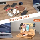 Description: Natural, Healthy, Safety ---100% Pure Moso Bamboo.**Actual color and wood grain may vary due to natural materials and color finish processing** Good Gift Idea --- Perfect for various occasions such as birthday party, weddings, ceremony, engagement, parties, commencement, Christmas, Fathers Day, etc. Surprising your husband, brother, dad, son, boyfriend, your friends, co-worker or boss. If this product does not meet your expectations, please do not hesitate to let us know. We will give you a satisfactory solution, thank you! Note: - Pictures are taken in kind, due to the different colors of the display, there may be deviations. - Due to manual measurement, there will be an error of +/- 5 mm. - Thank you for your understanding. Features and Benefits: ✅MORE SCENES AVAILABLE --- Folding wood tabletop storage has smart table management for convenient recharging and hide the devices cables easily. It is suitable for various occasions such as office desk, living room, guest room, bedroom dresser, kitchen or bathroom counter, entry or coffee table, foyer or hall table, coffee station. ✅EASY FOLDING DESIGN --- When this docking station organizer is not in use, simply fold it up. Store it like a slim book that fits on your bookshelf or in a drawer. Best of all, when you want to use it again, just follow the simple assembly steps to open it quickly. ✅ORGANIZE YOUR SPACE --- No assemble required! Just open it and get your space organized. Multi compartments for wallet, keys, pens, clips, watches, rings, coins, glasses or others. Package includes: 1x Table Organizer