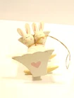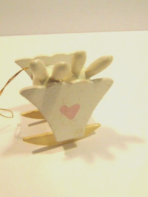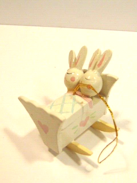 Here is a pre-owned, used wooden Easter ornament showing two baby bunnies sleeping in a cradle. The ornament is about 2 inches tall and is about 2 inches long. It shows some light dirt and wear on the paint. Please see pictures and ask any questions. Thank you for looking. (Inv A28,381)