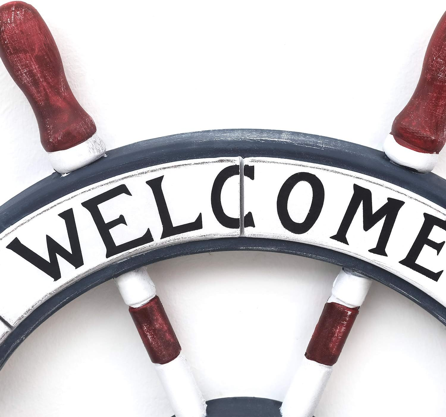 This gorgeous white wheel adds instant coastal charm to my entryway! The solid iron construction feels substantial and well-made, and the welcome message gives such a warm, inviting feel. Absolutely love it!