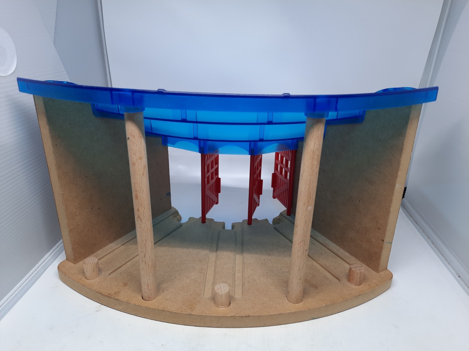 Toys 'R Us Wooden 3 Train Station Roundhouse Shed Track Turntable. Thomas the train compatible. Roundhouse piece has two pegs broken off. Scuffing and markings on roundhouse