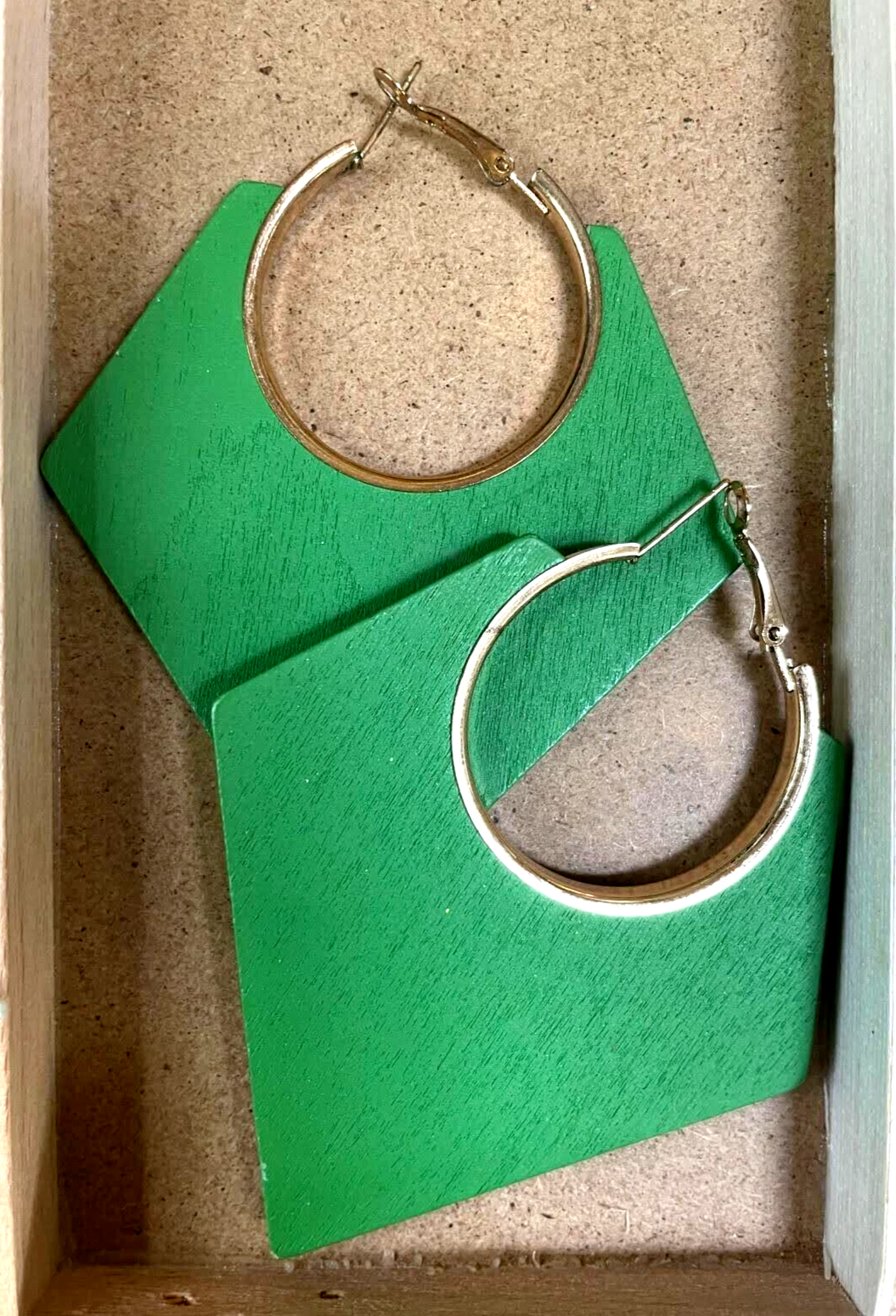 Add a pop of color to your outfit with these stylish green hoop earrings. Crafted from wood, these pre-owned earrings are perfect for the fashionable and adventurous woman. The leverback closure ensures a secure fit, while the hoop style adds a touch of elegance to any ensemble. There is a slight ding on the bottom of one of the earrings, but whether you're dressing up for a night out or simply want to elevate your everyday look, these earrings are a must-have addition to your jewelry collection.