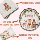 SERVE 32: This woodland creatures party decorations includes : 32 9"dinner plates + 32 7" dessert plates + 32 9oz paper cups + 32 napkins, can serves 32 guests. BIODEGRADABLE & DURABLE: Woodland creatures party supplies made of 100% food grade material BPA-free, no-toxic, biodegradable, eco-friendly, recyclable, heavy duty (350g white paperboard, thick and sturdy) won't folded, teared or broken easily, assuring paper plates party supplies set. HOLO PARTIES: The woodland creatures party decorations perfect for baby shower and animal theme birthday party. You can count on our decorative plate napkins and cup to add more elegance to your dinner table. DISPOSABLE EASY TO CLEAN: You can simply throw these out when making cleaning up after party and won't cause a environmental pollution. Save time and effortless. Let's spend more time with our family or friends. (NOTE: Do not microwave plates please.) SPLENDID SIZE FOR DINING:The woodland party supplies dinner plates measure 9” round and dessert plates measure 7" round with animal design. Paper cups hold approximately 9 oz of liquid. Napkins are 3-layer and measure 13 x 13 inches when unfolded and 6.5 x 6.5 inches folded.