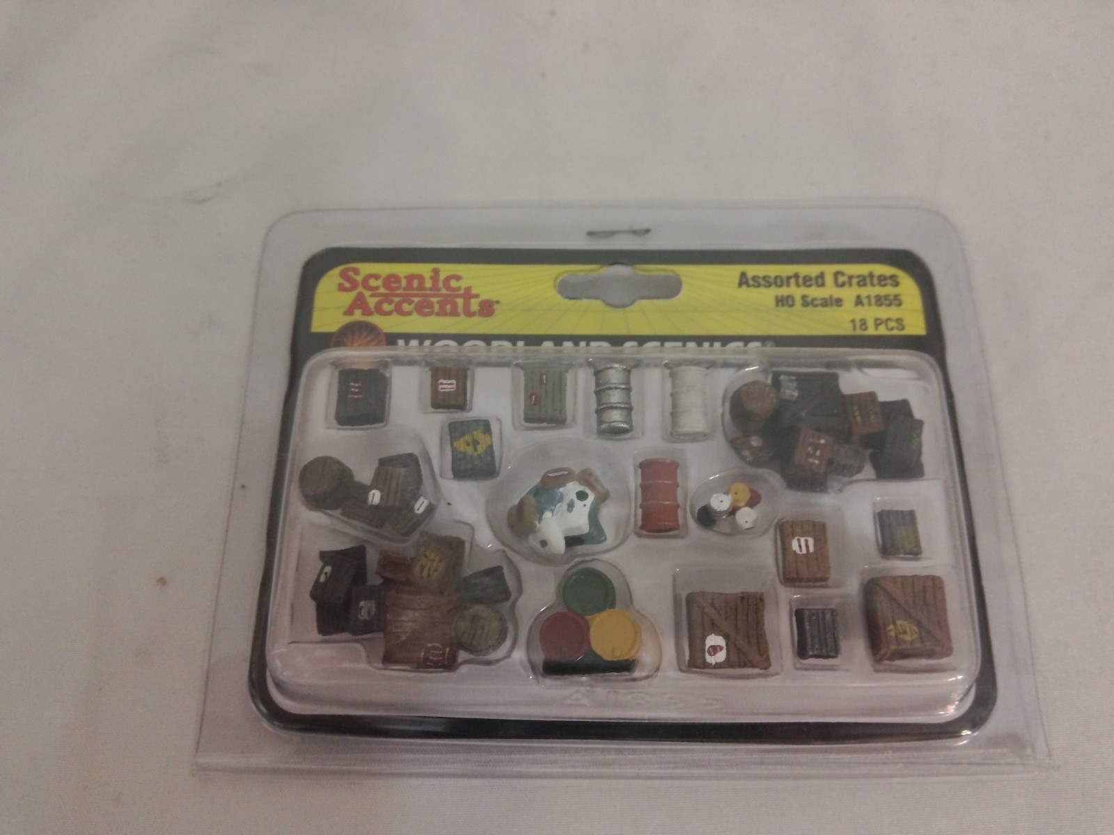 Woodland Scenics Scenic Accents Assorted Crates | Set #A1855 | HO Scale Condition: New in Box (NIB). This set is factory-sealed. Each piece is individually hand-painted with a realistic wood-tone finish and is ready to be used as layout scenery or flatcar loads immediately. Item Description Up for auction is a New set of Woodland Scenics HO Scale "Assorted Crates" (A1855) . Detailing a freight terminal or a busy pier requires realistic cargo, and this set delivers. Featuring a mix of large machinery crates and smaller shipping boxes, these accessories add depth and purpose to your industrial scenes. They are perfect for placing on station platforms, inside open boxcar doors, or stacked next to a warehouse siding. The matte, hand-painted finish ensures they blend perfectly with your weathered rolling stock and buildings. Listing Details Manufacturer Woodland Scenics Series Scenic Accents Set Name Assorted Crates Product Number A1855 Scale HO Scale Condition New in Box (Factory Sealed) Key Features Realistic Variety: Includes different sizes and styles of wooden shipping containers. Hand-Painted Detail: Subtle shading and wood-grain effects for a prototypical look. Freight & Logistics: Ideal for detailing LCL (Less-than-Carload) platforms and industrial zones. Multi-Use: Can be used as permanent scenery or as removable loads for gondolas and flatcars. Shipping & Handling We handle the heavy lifting! This set will be shipped in a rigid box to protect the factory blister and ensure the crates don't suffer any "shipping damage" on their way to you. Combined shipping is always available! 📦 WE COMBINE SHIPPING! Setting up a distribution hub? Check our other listings for "Dock Workers" and "Assorted Junk" to build a complete industrial vignette! Authentic Layout Details | Fast Shipping | Expertly Handled