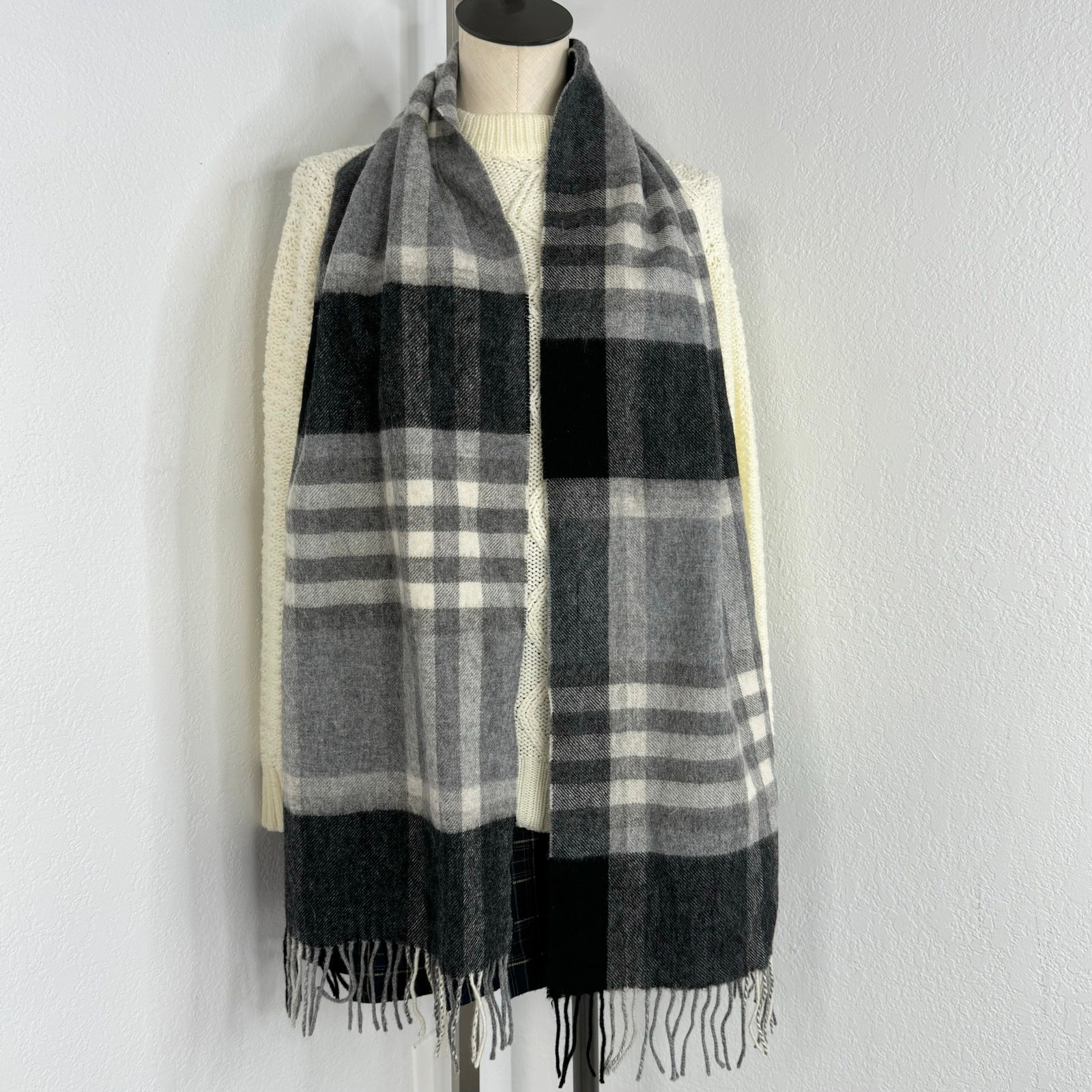 Lambs Wool Cashmere Blend Scarf Plaid Fringe Gray White and Black, The Royal Mile Scarf Bar Dark Academia, Good Condition 74”X 12.25”