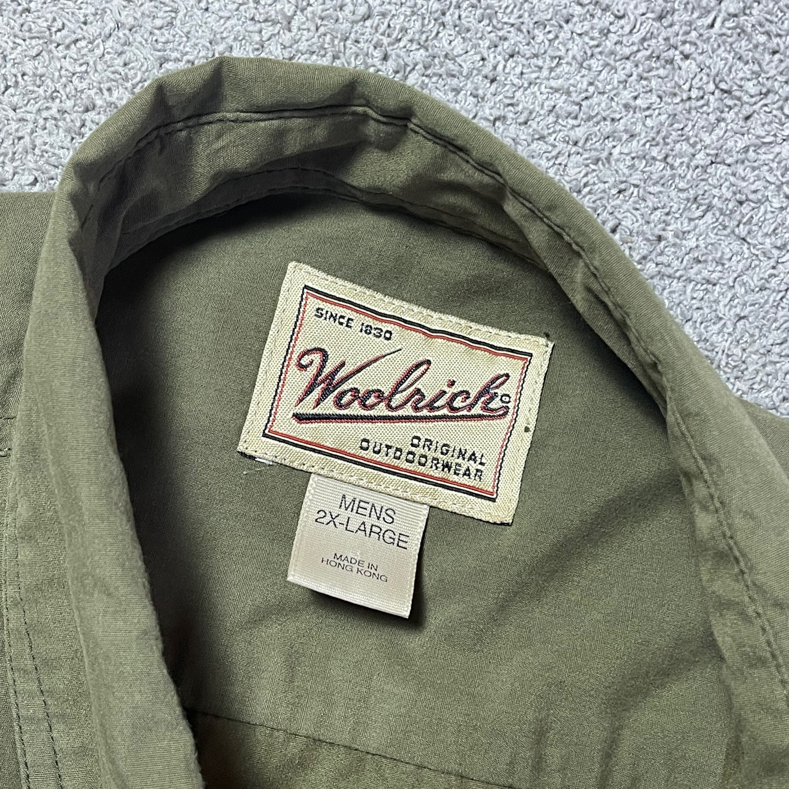 Country of Origin:Hong KongClosure:ButtonPattern:SolidSize:2XLProduct Line:EarthMaterial:Cotton, PolyesterDepartment:MenSleeve Length:Long SleeveFeatures:PocketsTheme:DesignerCollar Style:Button-DownSize Type:RegularType:Button-UpColor:GreenBrand:Woolrich
