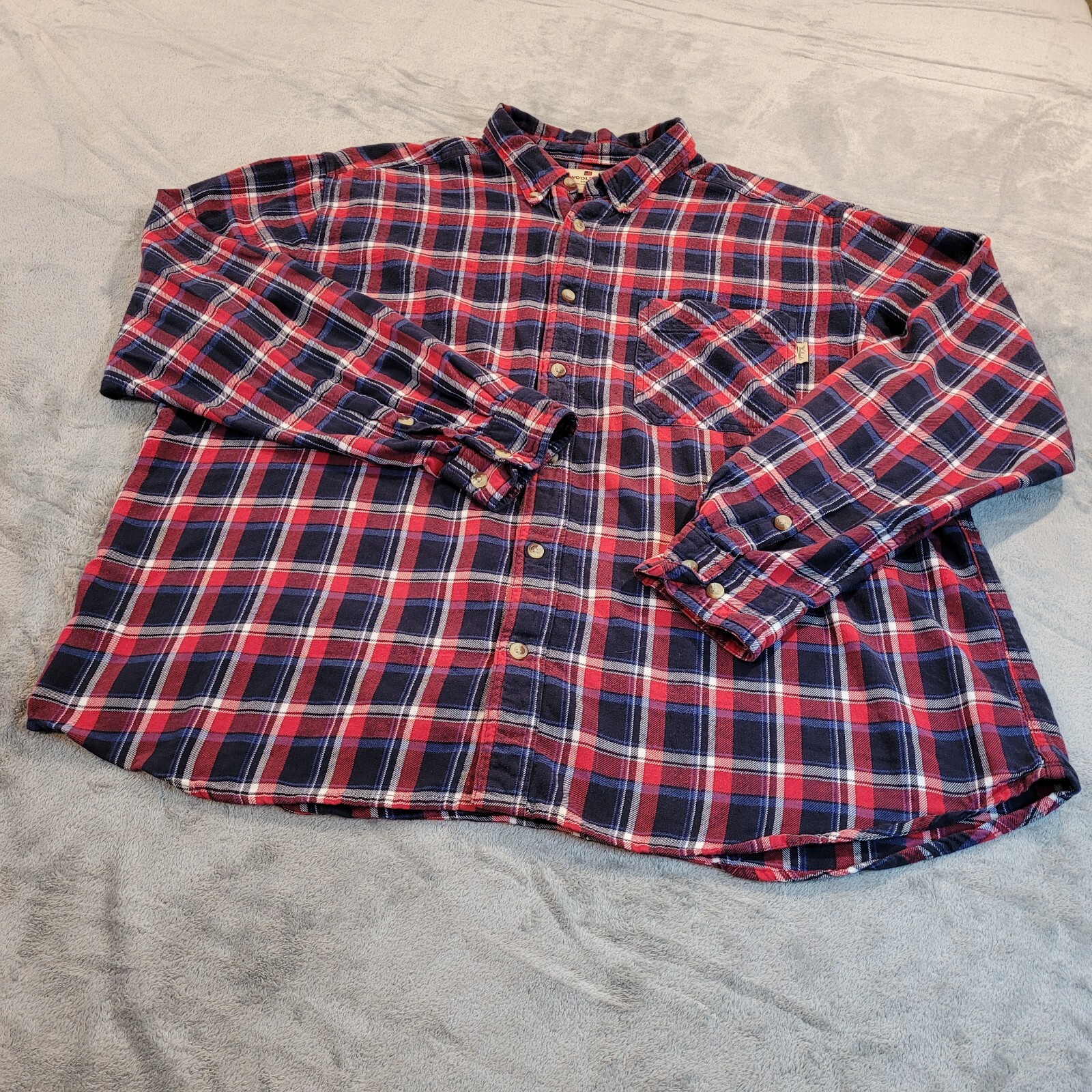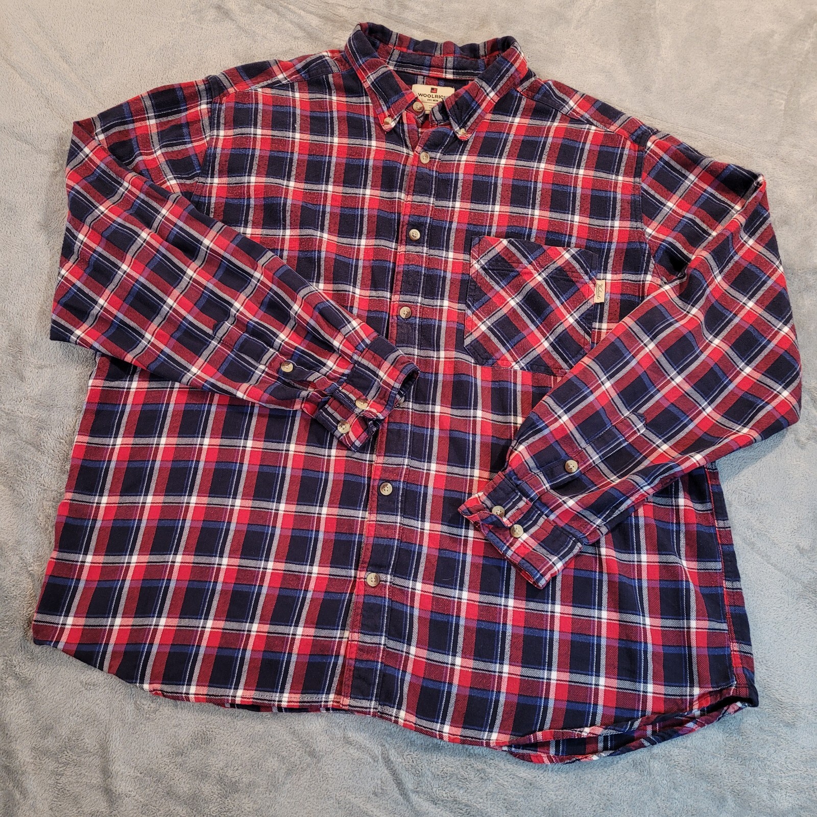 Woolrich Flannel Button Up Shirt Men's Size 2XL Plaid Long Sleeve Red Blue *READ*. Nice shirt, but there are a couple of flaws. One of the collar buttons is cracked. It is still functional, and there is a replacement available pictured above. There is also some fabric beading throughout the shirt. It's not horrible, but it is somewhat noticeable. There is no material tag that has a wool feel, but it is probably cotton due to the beading. Please view all pictures and feel free to ask questions. Measurements pit to pit: 28 in Measurements top to bottom: 30.5 in We do our best to provide accurate descriptions and measurements. If you have questions, please feel free to message them. We appreciate your business and strive to ship fast! USED Clothing Disclaimer: Some of our items are sourced from second-hand retailers. Due to people having allergic reactions, we only launder clothing if it is absolutely necessary. We recommend washing before wearing. đź§ş Thanks! Mom code: Woolrich Plaid Red XL 7.28