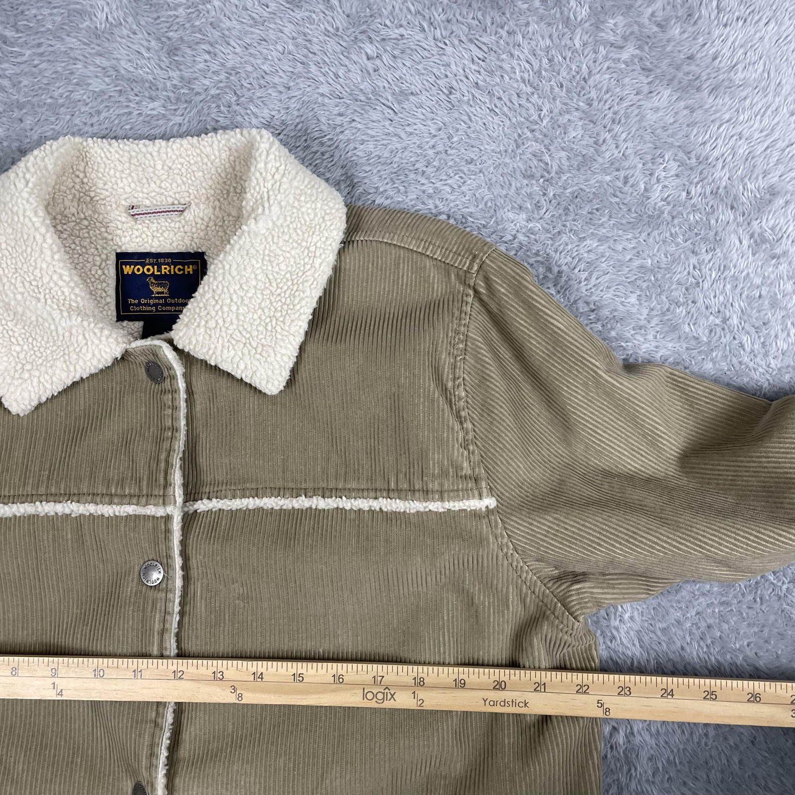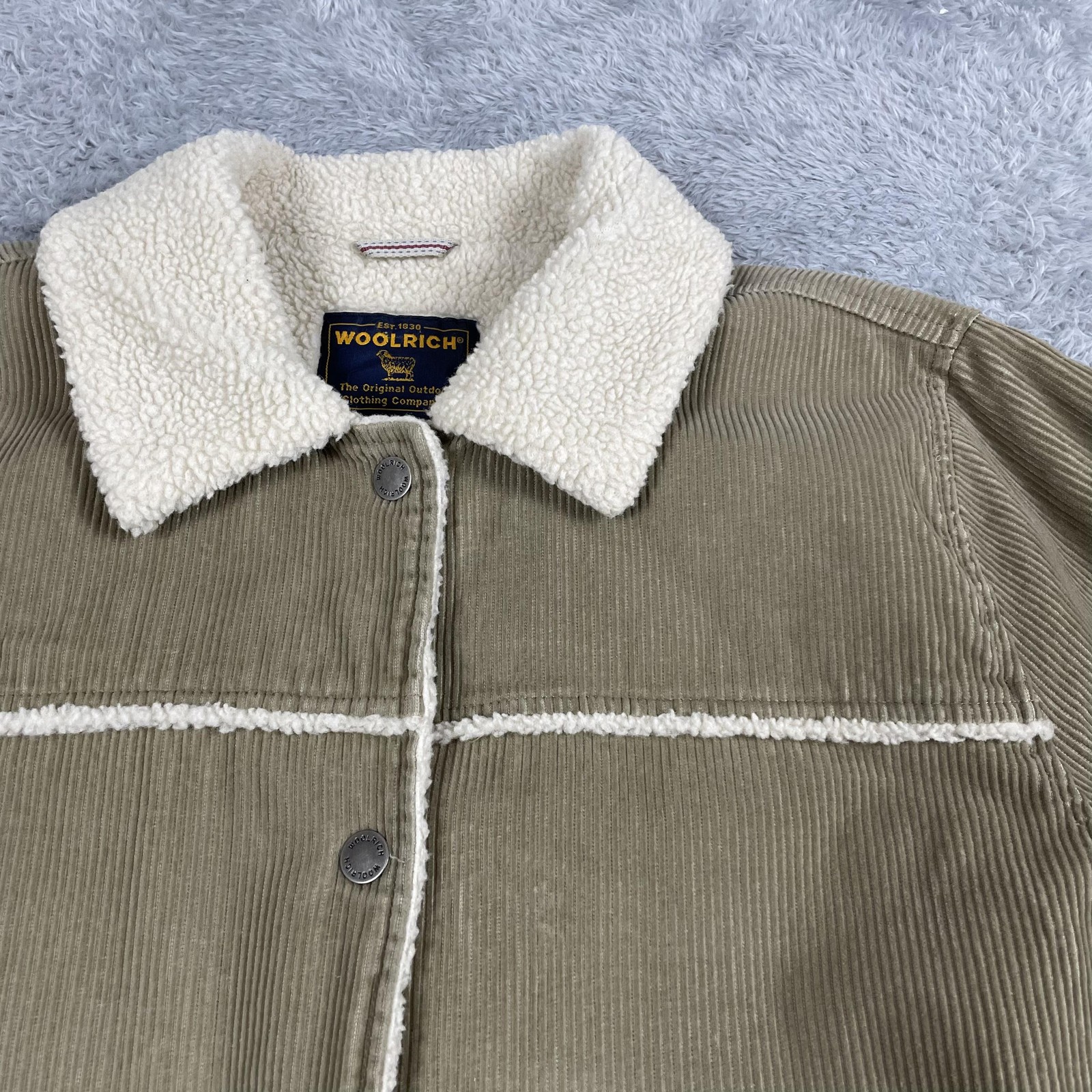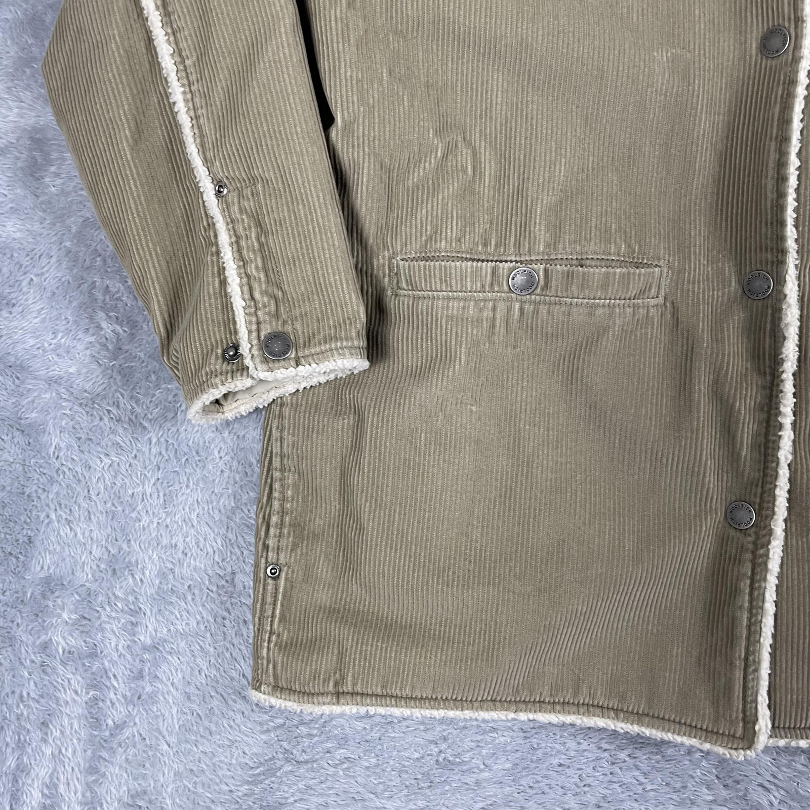 Brand: Woolrich Style: Womens long corduroy jacket with sherpa fleece lining and collar, designed as a warm outdoor coat. Size on tag: Womens Large (L) Color: Dark Wheat exterior with off white sherpa lining and trim. Materials (per tag): Shell 100% cotton; lining 80% polyester and 20% acrylic; sleeve liner 100% nylon with 100% poly filler. Style/Model code: 15514; additional tag codes: WPL 6635, CA05331; made in China. Details: Snap front closure, faux shearling sherpa spread collar, full sherpa body lining with quilted lower lining, two front welt pockets with snap closures, snap cuffs, corduroy exterior, straight hem, longer parka-style length.