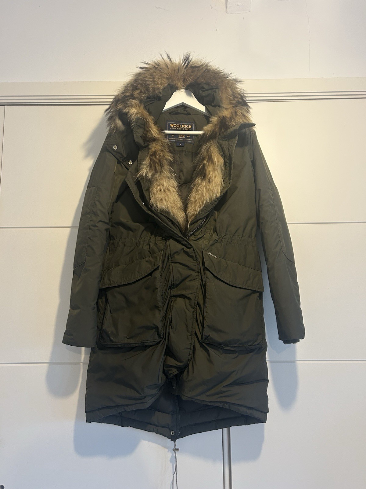 The Woolrich Women's Fur Parka in Khaki Green, size small, is a stylish and practical hooded coat perfect for casual occasions. Made from durable nylon outer shell material with warm down insulation, this coat is designed for winter wear. The accent of fur trim adds a touch of luxury to this classic parka style from the Woolrich Arctic collection. Machine washable for easy care, this regular fit coat is a must-have for women looking to stay cosy and fashionable during the colder months.