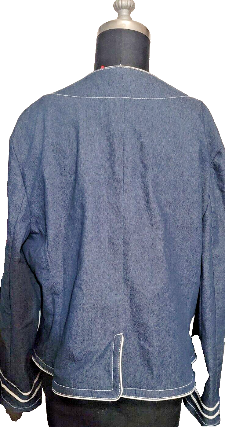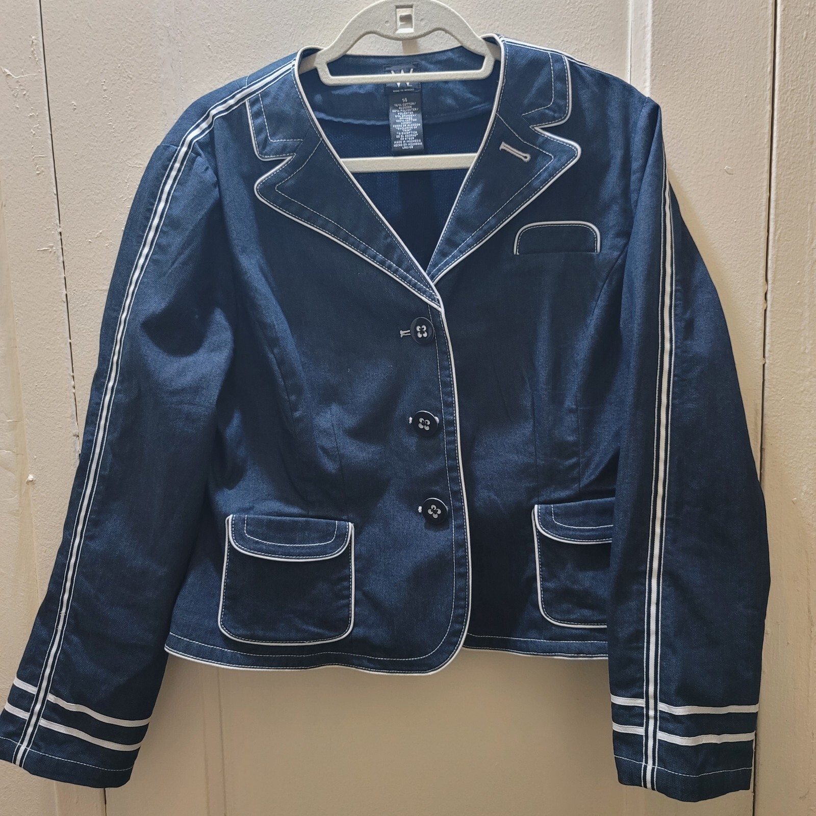 Upgrade your layering game with this stylish blazer from Work to Weekend . Crafted of blue stretch denim blend (cotton/poly), this size 14 jacket offers comfort + structure. White trim gives it a crisp contrast. Perfect for dressing up casual looks or adding polish to jeans outfits. Features & Details: Brand: Work to Weekend Style: Jean Jacket / Denim Blazer Material: Stretch Cotton/Poly blend — comfortable and flexible Color: Medium Blue denim with white trim accent Size: Women’s 14 ( Regular Fit ) Sleeve: Long sleeves Closure: Button front Jacket Length: Short / Hip-length Condition: Pre-owned in Very Good condition. Gentle wear visible — no big flaws. Photos show all details. Why It’s Great: Stretch denim gives comfort & ease of movement White trim makes it pop — adds style to your outfit Versatile: works with dresses, jeans, skirts, casual or semi-formal looks Very cute jacket L21" W20" Sleeve 24" Please allow slight manual measurement deviation for the data 1-2cm error. Due to the difference between monitors and light brightness, the real color of the item may be slightly different from the pictures shown.