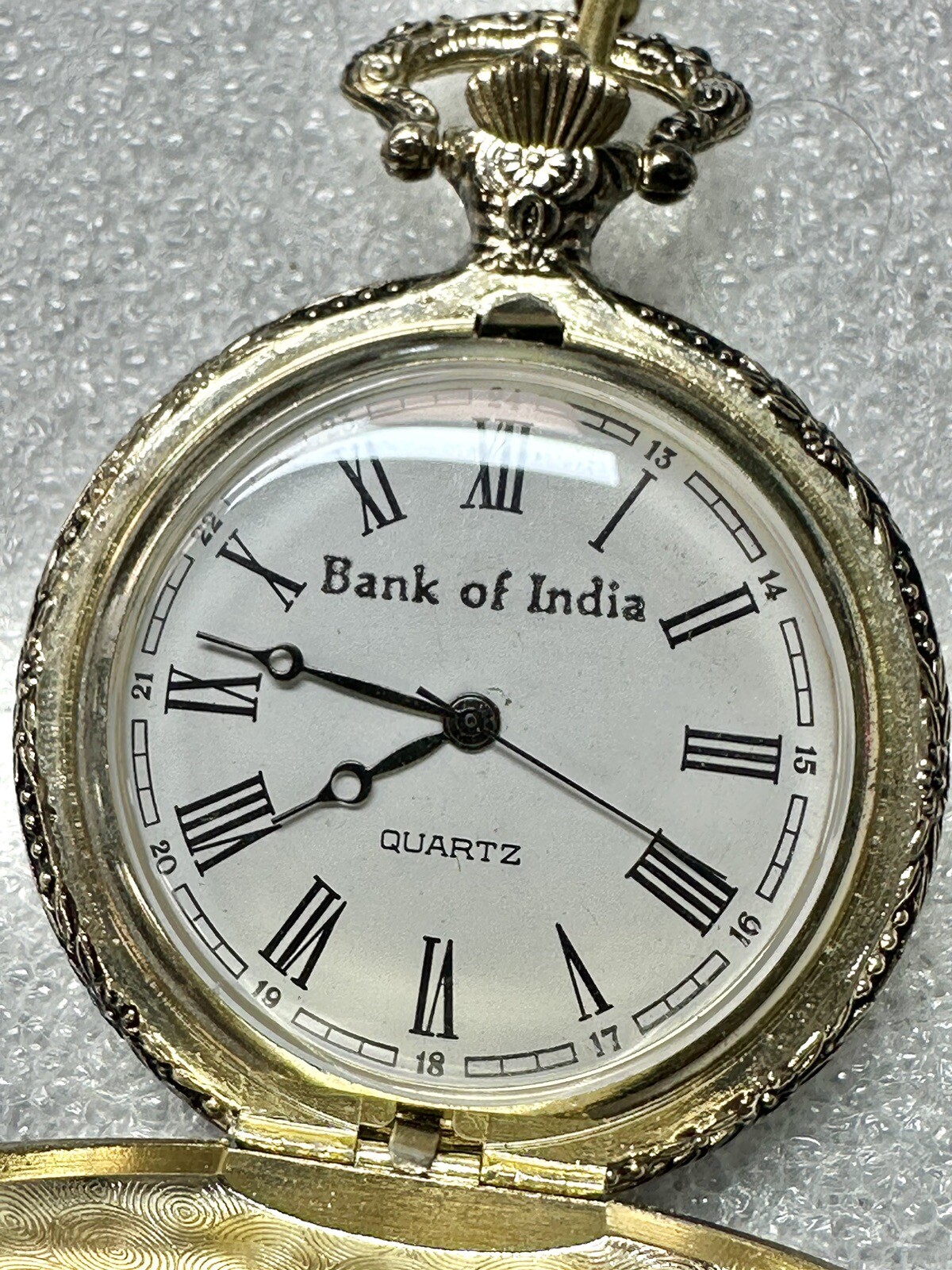 Working Bank Of India Quartz Pocket Watch W 3 Horse Gold Tone Design + Chain. Condition is Pre-owned. Shipped with USPS Ground Advantage.