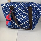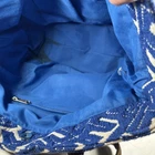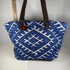 This World Market Blue Embroidered Bohemian Bag is a stylish tote designed for women. The bag features a vibrant blue exterior color with intricate embroidered accents, giving it a bohemian flair. Made from cotton material, this bag is ideal for adding a pop of color and a touch of global-inspired charm to any outfit. Perfect for carrying essentials while embracing a unique and eclectic style, this World Market bag is a fashionable accessory for any woman on-the-go.