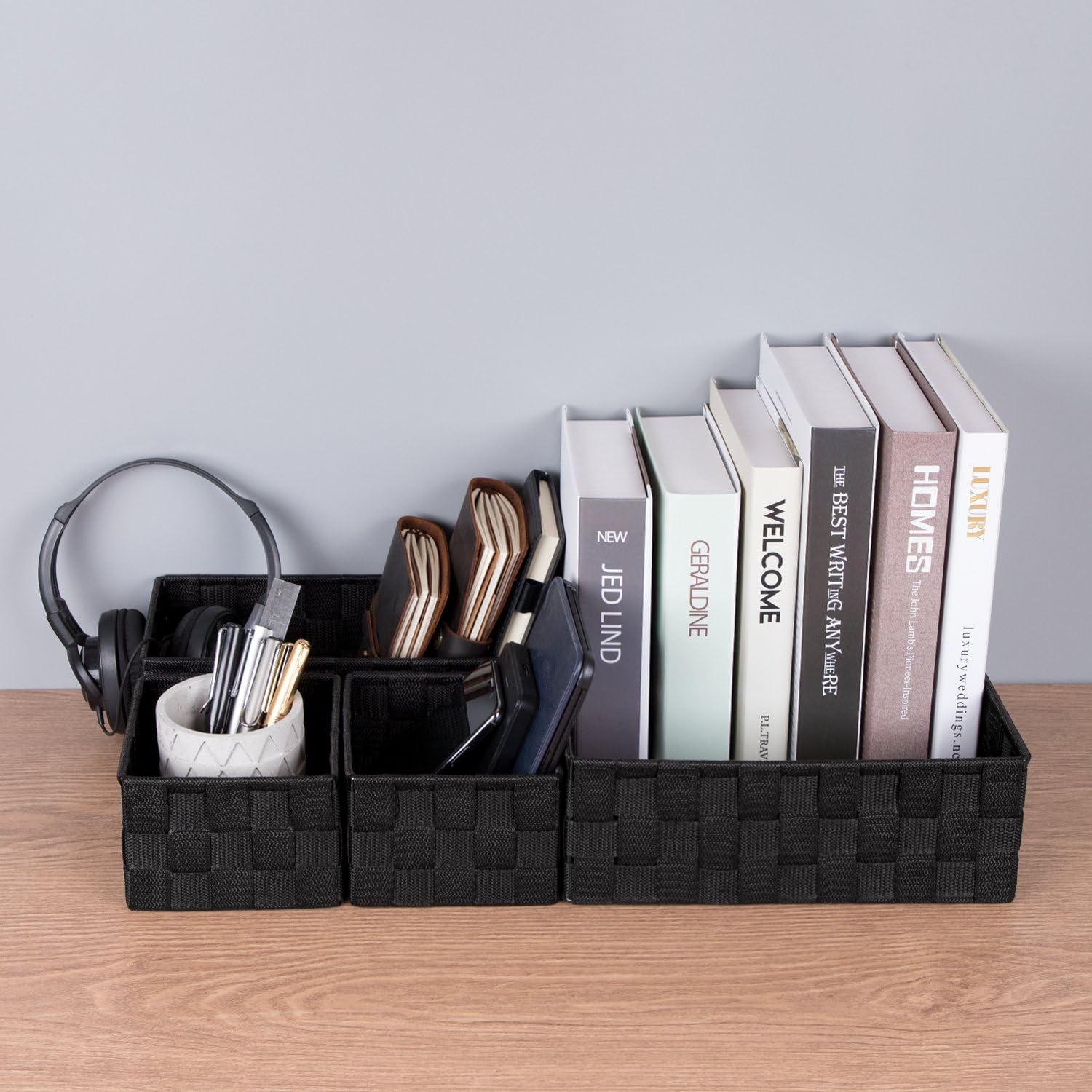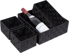 Woven strap A set of 4PCS: The woven basket includes 1 large and 3 small organizer boxes that are perfect in the drawer. Measure about(L×W×H):11×11×3.9inches,10×5×3.7inches, 5×5×3.7inches FIRM METAL FRAME:The frame of all woven organizer bins is inserted with steel wire, enough firm and not easy to be distorted like cloth drawer STURDY: The closet drawer is pure hand made from woven strap, 10 times more durable and long-lasting than cloth drawer MULTI-USE:These storage baskets for shelves can be used as makeup organizer,bathroom organizer,nursery organizer,office organizer,desk organizer,shelf organizer,kitchen organizer,good gift for back to school FIT ALL PEOPLE: The black organizer bins keep grocery and accessories organized and easily accessible for all kinds of people:student,baby,children,woman,man;for all purposes:toys, grocery,grocery,undergarments Product description Posprica small woven black baskets These storage baskets for shelves can be used as makeup organizer,bathroom organizer,nursery organizer,office organizer,desk organizer,shelf organizer,kitchen organizer. Includes 1 large and 3 small organizer boxes that are perfect in the drawer. Measure about(L×W×H):11×11×3.9inches, 10×5×3.7inches, 5×5×3.7inches. FIRM METAL FRAME The frame of all woven organizer bins is inserted with steel wire, enough firm and not easy to be distorted. STURDY The closet drawer is pure hand made from woven strap, 10 times more durable and long-lasting than cloth drawer. EASY TO CLEAN This basket is made of polypropylene strap, soft , durable and easy to wash.