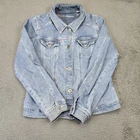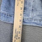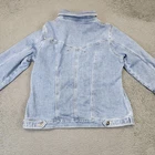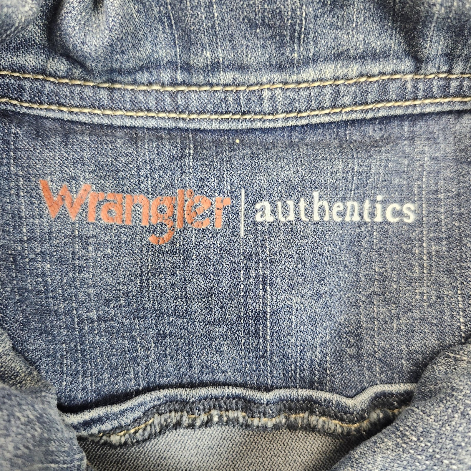Brand: Wrangler Authentics Item: Denim trucker jacket Gender: Womens Tag size: XL Color: Light wash blue Details: Metal Wrangler button front; pointed collar; long sleeves; chest flap pockets; adjustable waist tabs; contoured princess seams Logos/Markings: "Wrangler authentics" printed at neck; Wrangler-branded metal buttons Country of origin: Made in Bangladesh (per inner tag) Measurement photos are included for reference; see images for scale only Notes: Classic jean jacket styling ideal for layering