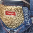 Wrangler Flannel Sherpa Lined Button Down Shirt Jacket Size L Blue White Plaid The Wrangler Flannel Sherpa Lined Button Down Shirt Jacket is a men's casual button-up shirt in size L. The shirt features a blue and white plaid pattern with a button-down collar and long sleeves. Made of cotton flannel, this shirt jacket has a sherpa lining for added warmth. The Wrangler brand ensures quality and the regular fit provides comfort for everyday wear. This colorful shirt is accented with buttons and is a stylish addition to any casual wardrobe.