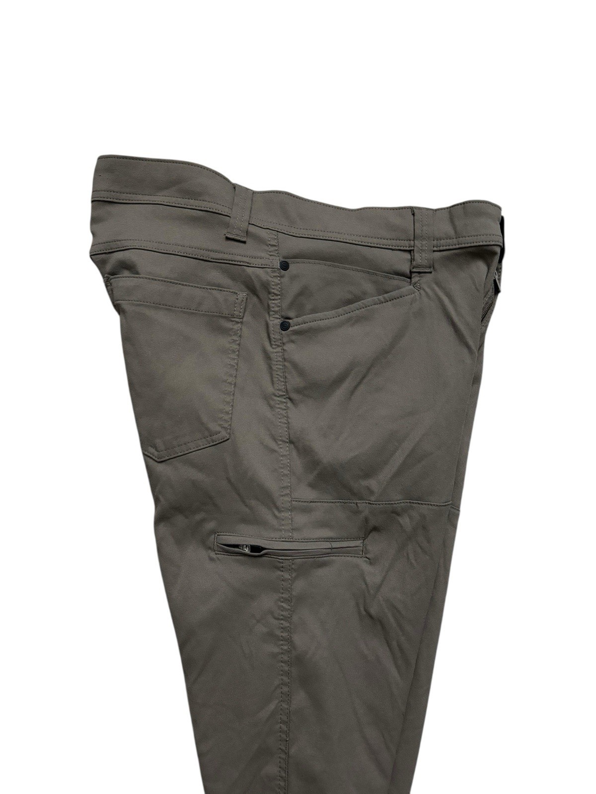 Piling below crotch (pointed out). These Wrangler Men's Pants in size 34x30 offer durability and flexibility for outdoor activities like hiking and camping. The dark khaki color and cargo style provide a practical and comfortable fit for various occasions. Made with a nylon and spandex blend fabric, these pants feature a mid-rise waist and straight leg design. The quick-dry and stretchy material ensures comfort while the multiple pockets add convenience for storing essentials during adventures in all seasons. Perfect for the outdoorsman looking for reliable and versatile pants.