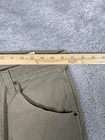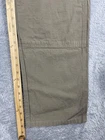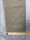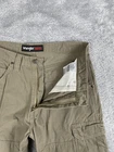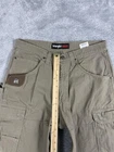 Brand: Wrangler Riggs Workwear Style: Mens workwear cargo carpenter pants in durable ripstop cotton. Color: Khaki brown Size on tag: 33 x 34 WAIST MEASURES 32-33" Materials: 100% cotton; made in Nicaragua of US fabric Style/Model code: 3W060BR; RN 130273; CA 55394 UPC: 051071448895 Details: Zip fly with button closure, belt loops, front hand pockets, leather R utility pocket, hammer loop, cargo leg pockets with flap closures, back patch pockets with zippered openings, reinforced knee panels, rugged workwear construction.