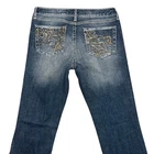 Features: • Brand: Wrangler • Type: Jeans, Bottoms • Style: Bootcut, Boot Cut • Line: Rock 47 • Front: Flat • Season: Spring, Summer, Fall, Winter • Pattern: Solid • Made in China • Care: Machine Wash • Rise: Ultra Low Rise • Color: Blue, Gold • Wash: Medium • Features: Embroidered, Studded • Closure: Zipper Fly • Material: Denim, 98% Cotton, 2% Spandex • Size: Junior's 9 • Condition: Good, some fading and wear, Laundry scent • Other: Western, Cowboy, Cowgirl, Dance, Rodeo, Show Measurements are Approximate: Length: 42 in / 107 cm Waist: 15 in / 38 cm Hips: 19 in / 48 cm Front Rise: 8.5 in / 22 cm Thigh: 10 in / 25 cm Inseam: 34 in / 86 cm Width at hem of leg: 8.5 in / 22 cm Orders shipped within 1-2 business days. 01127054901