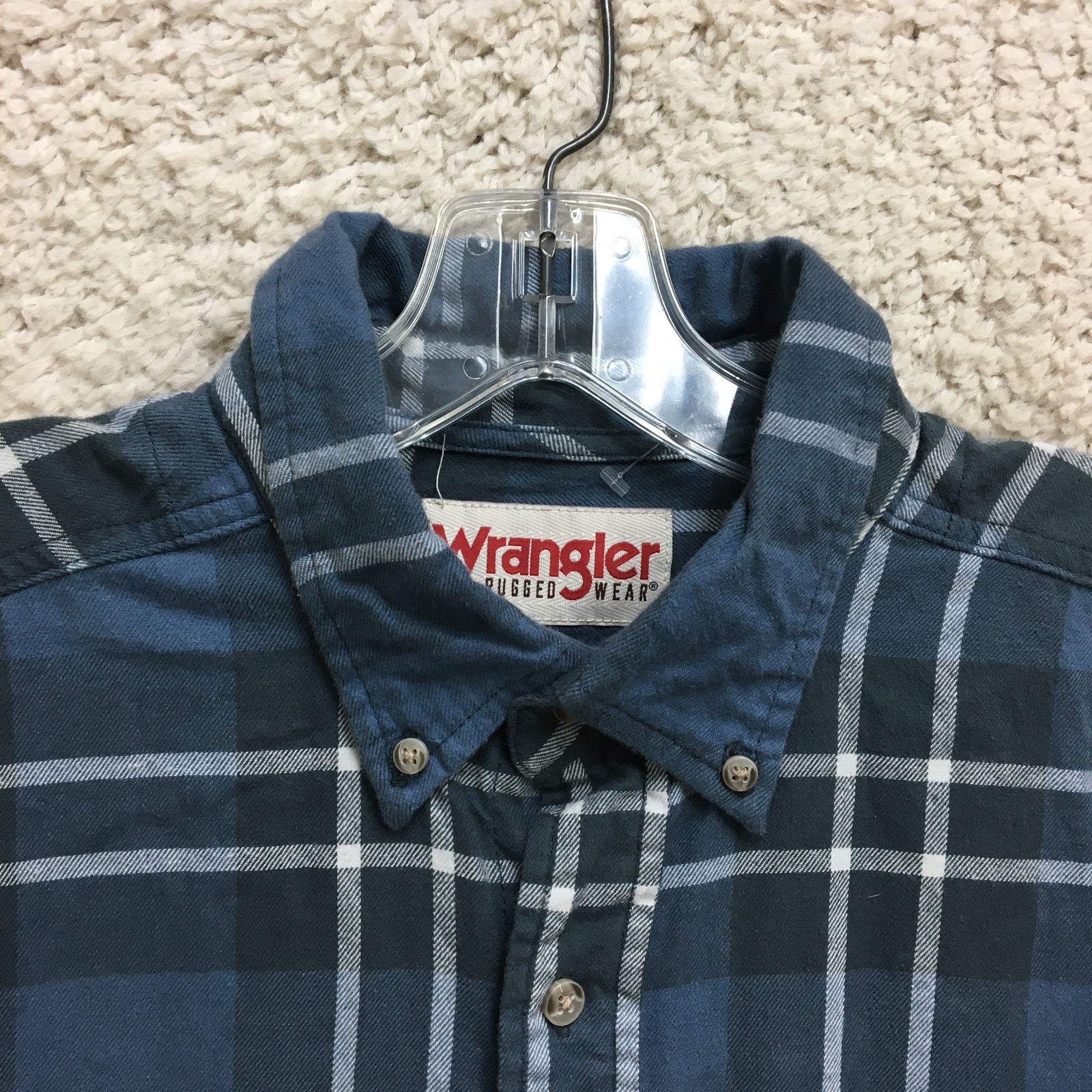 Wrangler Shirt Mens Large Blue Gray Plaid Flannel Button Down Long Sleeve Western Condition: Good used condition with minor wear, no holes or stains noted Classic blue and gray plaid pattern with white accents Button front closure and button-down collar for a sharp look Features two chest pockets with button flaps 100% cotton flannel for comfort and warmth Wrangler Rugged Wear tag at neck Tag size: Large (Mens) Pit to pit measurement: approximately 25 inches Back length (collar seam to hem): approximately 32.5 inches Perfect for casual wear, workwear, or outdoor activities Classic Wrangler western style flannel shirt