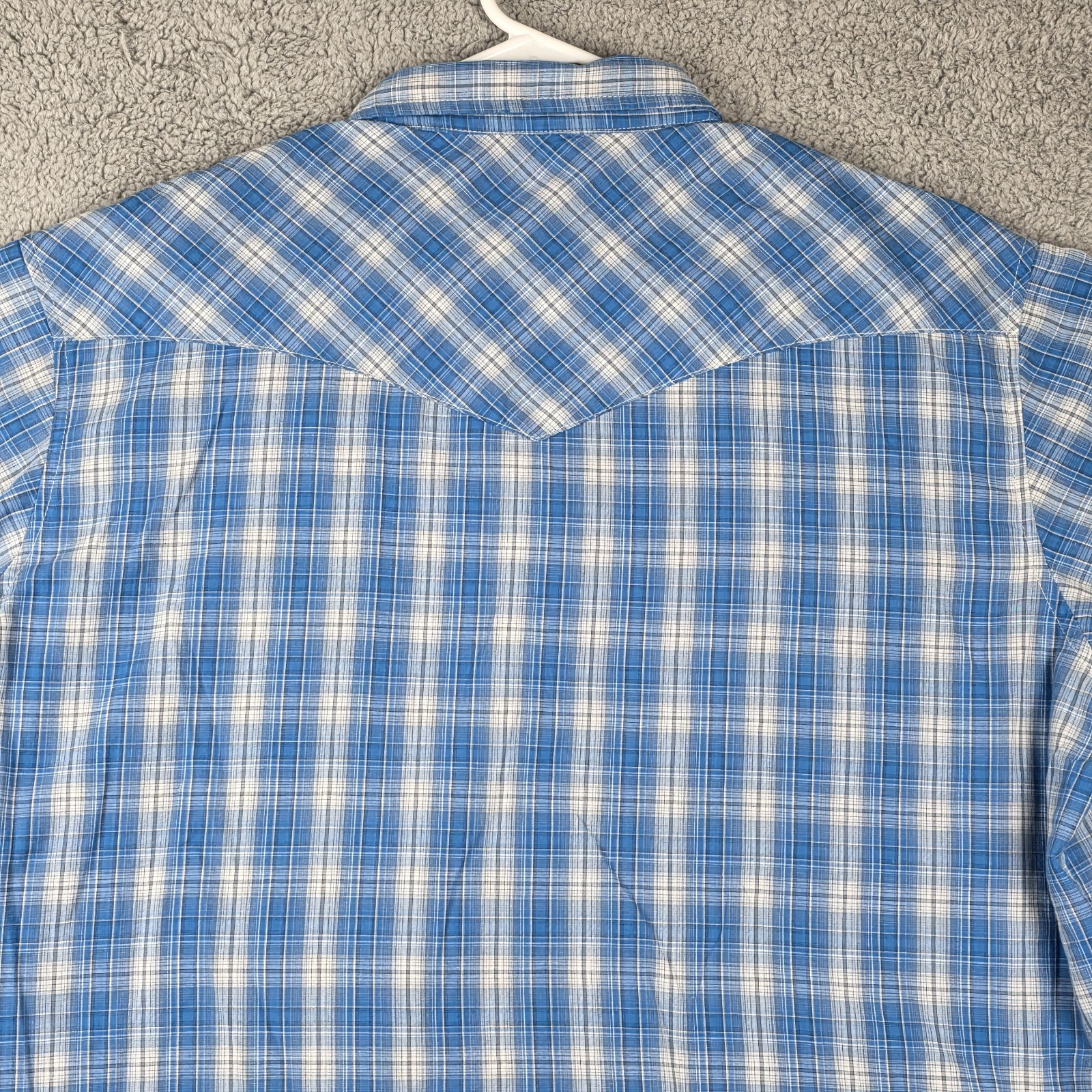 Classic Wrangler Western Pearl Snap Shirt in a crisp light blue plaid pattern — perfect for casual wear, rodeo, or country-western styling. Details: Size: Men’s XL, Pit to Pit 25", Shoulder to Hem 30.5" Color: Blue / White Plaid Material: 55% Cotton / 45% Polyester Snap-front closure Two snap chest pockets Western yoke front & back Pearl-snap cuffs Wrangler “Western Shirts” label Made in Bangladesh Pre-owned, excellent condition. No holes, stains, or major wear noted. Clean and ready to wear.