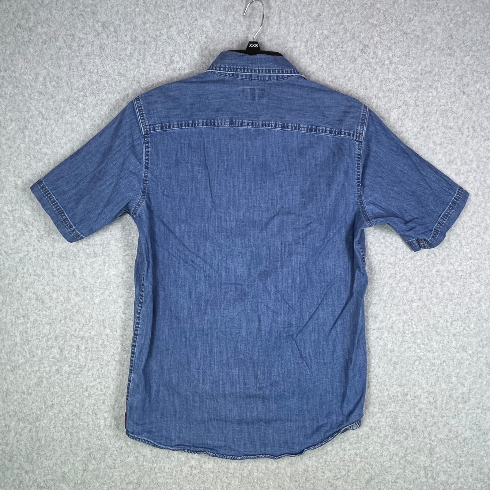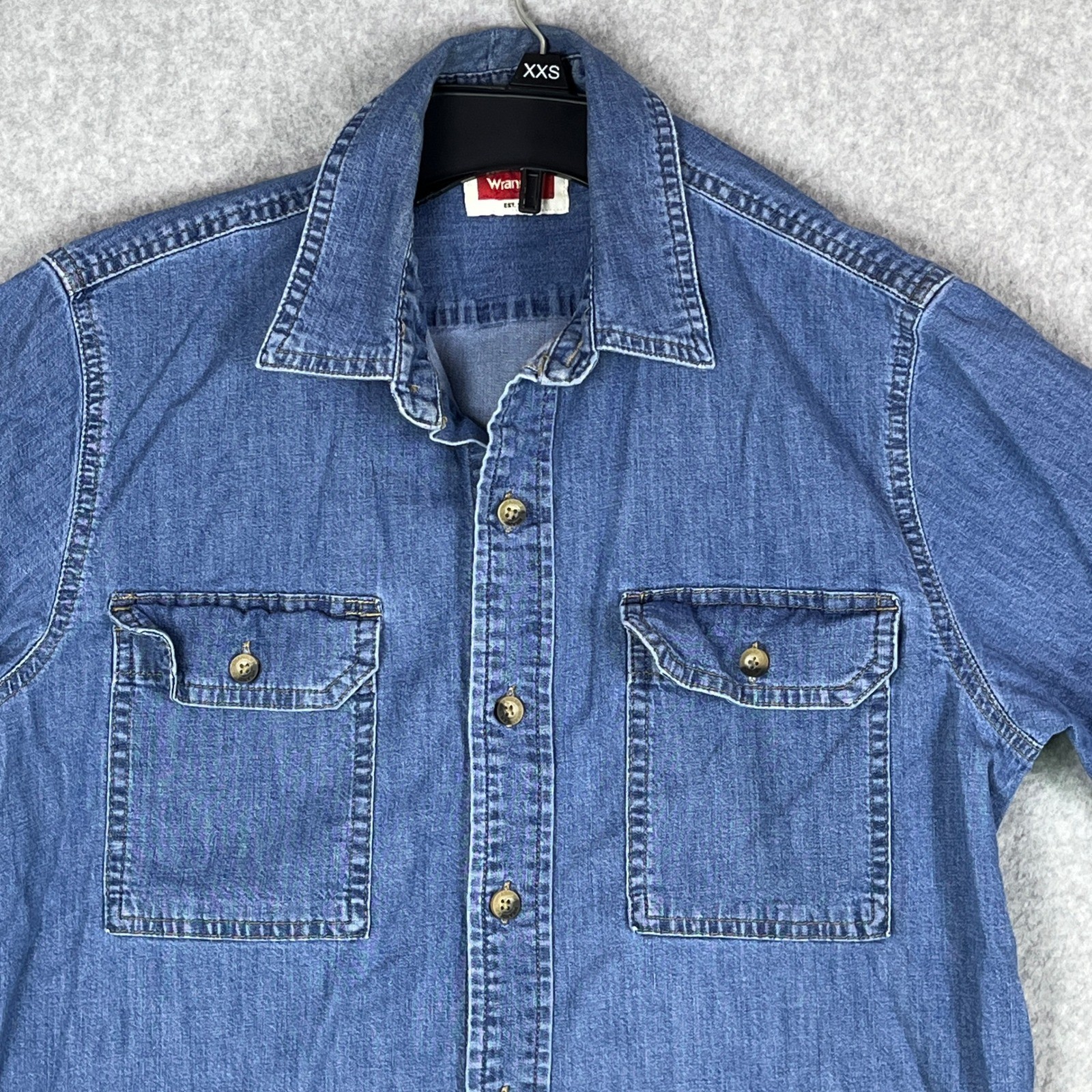 Classic Wrangler short-sleeve denim shirt in a medium blue wash. Made from a comfortable cotton-spandex blend for just the right amount of stretch. Features double-flap chest pockets, a button-front closure, and a Wrangler logo tag. Perfect for casual wear, work, or layering with your favorite tee. Simple, timeless, and durable — Wrangler's signature style in an easy, everyday piece.