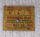 Wrestling Madison Square Garden 5/26/1936 Ringside Ticket Measures approximately 1 7/8" x 2 1/4". Please note that this ticket was affixed to a cardstock backing. I don't know if the remaining cardstock can be safely removed from the back of the ticket without damaging the ticket. A hole was punched in the ticket. Ticket has discoloration, creasing and wear to the edges from age, handling and storage. Please see photos for more information on condition and ask any questions you may have.