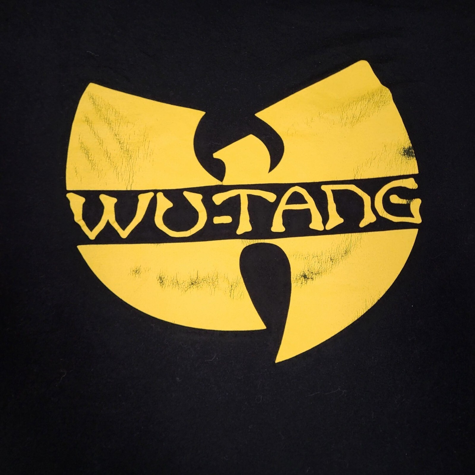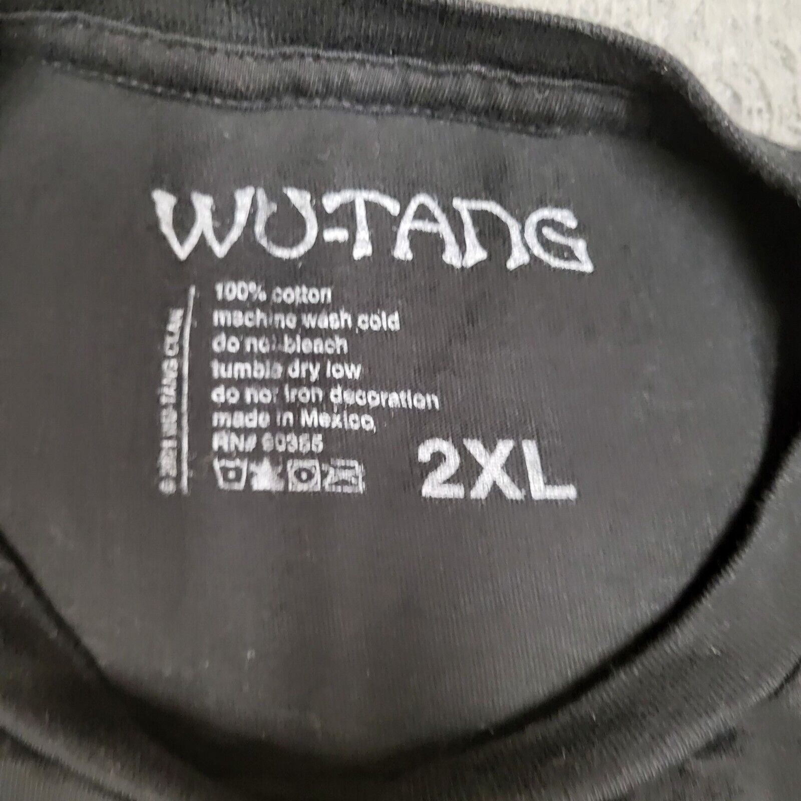 Showcase your love for Wu-Tang Clan with this 2XL black T-shirt. Featuring a bold yellow logo, this 100% cotton shirt offers comfort and style. • 2XL size • 100% cotton • Black T-shirt with yellow Wu-Tang logo • Machine washable • Made in Mexico Some minor wear on the logo. Top to bottom = 29 inches Armpit to armpit = 28 inches