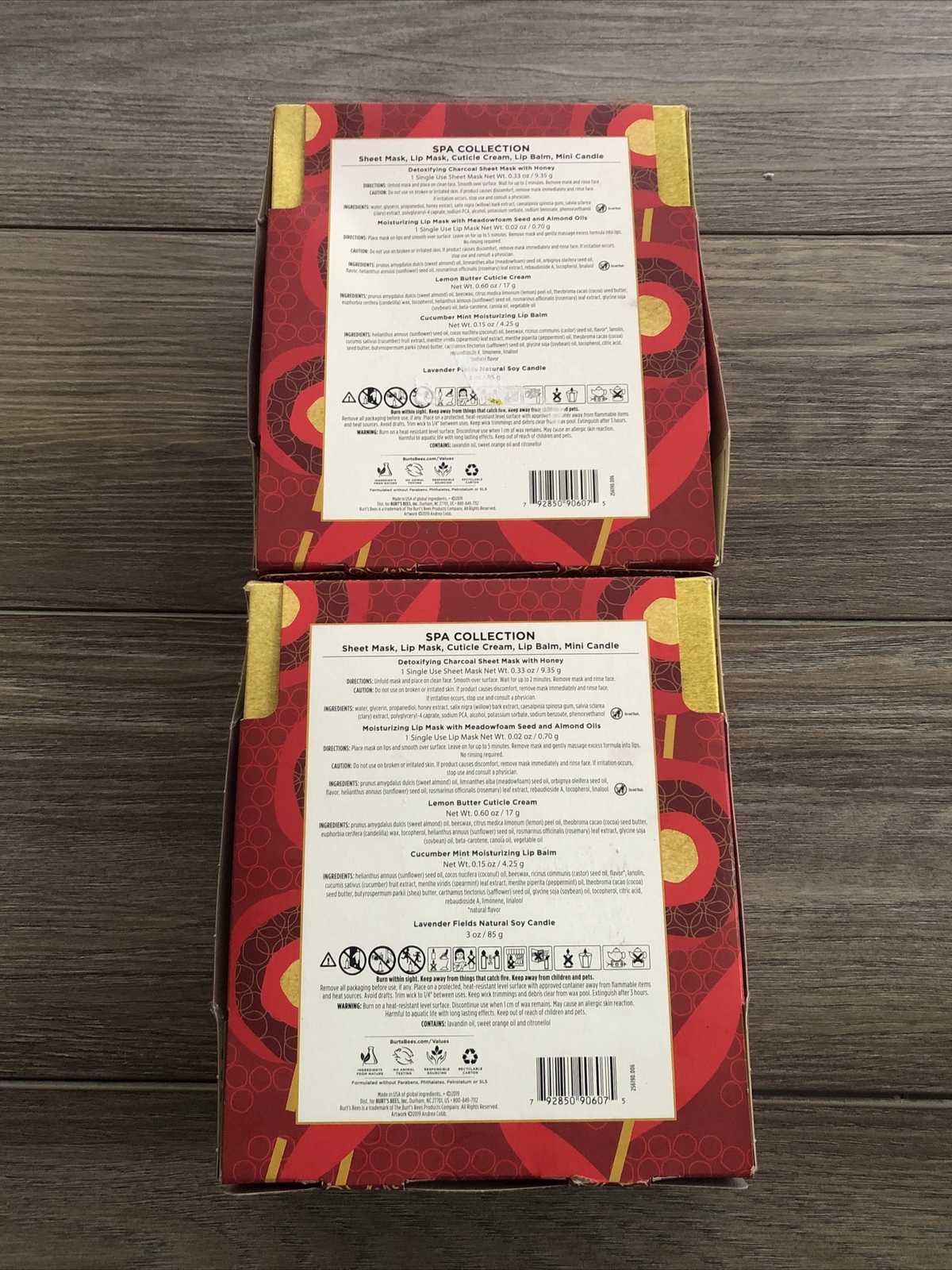 X2 Burts Bees Spa Collection Gift Lip Balm Cuticle Cream Charcoal Mask Candle+. You will receive 2 kits, each of which includes Moisturizing Lip Mask w/Meadowfoam Seed & Almond Oils, 0.02oz EA; Lemon Butter Cuticle Cream, 0.60oz EA; Cucumber Mint Moisturizing Lip Balm, 0.15oz EA, and Lavender Fields Natural Soy Candle, 3oz EA.