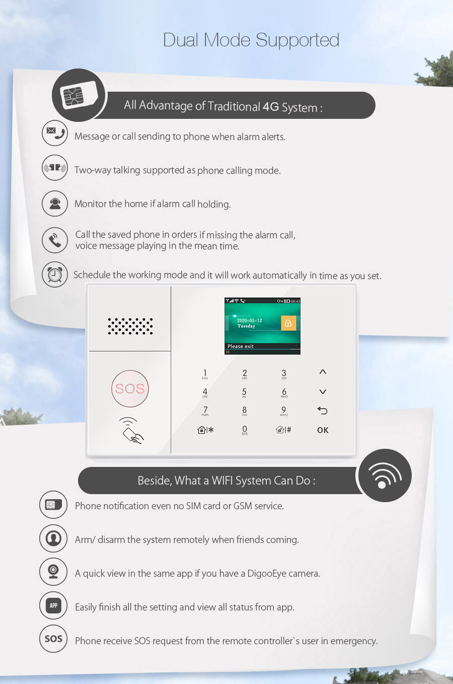 Advantage of 4G alarm system: Australia, United States, Canada has cut the 2G sim card service. And United Kingdom, Mexico, Euro Union, ect will cut the 2G sim card in coming years. Without 2G networks, 2G/GSM only alarm system will fail to achieve it's major function, remote control through calls and SMS. To provide customers with longer alarm system lifespan, our company is launching a series of it's 4G alarm system which are both 4G/3G/2G(GSM) Network compatible. The 4G alarm system will work with United States, Australia, United Kingdom, Euro Union, Canada and most countries' 4G Sim card(Except China, Japan and Korea). The 4G alarm system support use 4G sim card to receive SMS message or phone call to remote control the alarm system(2G alarm system not support sim card function) 4G+WiFi Tuya Home Alarm System+Strobe Light Siren Description Payment Shipping Return Policy Feedback Contact Us Description The advantage of 4G alarm system. Because Australia, United States, Canada has cut the 2G sim card service. And United Kingdom, Mexico, Euro Union, ect will cut the 2G sim card in coming years. Without 2G networks, 2G/GSM only alarm system will fail to achieve it's major function, remote control through calls and SMS. To provide customers with longer alarm system lifespan, our company is launching a series of it's 4G alarm system which are both 4G/3G/2G(GSM) Network compatible. The 4G alarm system will work with United States, Australia, United Kingdom, Euro Union, Canada, Mexico, and most countries' 4G Sim card(Except China, Japan and Korea). The 4G alarm system support use 4G sim card to receive SMS message or phone call to remote control the alarm system(2G alarm system not support sim card function). This listed alarm system offers 2 models of 4G sim card module. 1. Alarm system with the most suitable module(1 out of 2) will be shipped based on shipping address unless otherwise requested. 2. For cost saving purpose, you may need 4G Sim Card which only comes with voice and SMS plan(data subscription not required). 3. Sim Card module in each model supports frequencies and ONLY requires you 4G network to work on one of the frequency. Applicable Area USA/Australia 4G alarm system work on United States, Australia, Canada, Mexico, South American, North American. Euro 4G alarm system work on Euro Union, United Kingdom and other Euro countries, Africa, Asia(except China, Japan and Korea). Package Including:(ALL sensor's battery included 4G+WiFi Main Panel(100 Wireless Zone+3 wired zone) * 1 Pcs (Support Connect Amazon Alexa, Google Assistant, IFTTT, etc) Wireless PIR Infrared Detector * 2 Pcs Wireless Door / Windows Sensor * 12 Pcs Wireless Remote Control Key * 4 Pcs RFID Tags * 4 Pcs Wired Siren * 1 Pcs(110dB) Wireless Strobe Light Siren * 1 Pcs(135dB Loud) Built-in Siren * 1 Pcs(85dB, the siren is built-in main panel) AC Adapter * 1 Pcs English User Manuel * 1 Pcs (NOT Including Sim Card) Frequently Qustion & Answer: Q: What kind of Sim Card support? A: The alarm system is 4G version, it support 4G+3G+2G(GSM) Sim Card, the sim card detailed I have writed in the description. Q: Can this alarm system work with Amazon Alexa or Google Home? A: Compatible with Alexa and Google home: This alarm sysetm works with Amazon Alexa and Google Home for voice control ( Alexa and google home devices not included ). Just ask app Alexa on your phone to Arm / Disarm/ the whole system in a specific instruction like "Alexa, please arm the alarm system". Remote control your Alarm system anywhere in the world with your smart cell phone, no need repeated operation! Q: Can this alarm system work with WIFI and 4G Sim Card together? So if the WIFI failure, can switch Sim Card mode to work. A:Yes. User can connect alarm system with WIFI and 4G Sim Card to work. And when Alarm System be triggered, it will push alarm message to the APP via WIFI. And if the WIFI failure, will change Sim Card mode auto Dial Out. Q: It just with WIFI in my house and without 4G Sim Card,can I use this alarm system? A: Yes. Alarm System can work in WIFI mode only. The alarm system only support 2.4G WiFi, NOT support 5G WiFi. Q: Can I add additional remote controllers, door sensors, pir sensors, smoke detectors, gas detectors or other sensors to work with this alarm system? A: Yes. Alarm system can work up to 99 wireless sensors(wireless freq 433MHz) and wireless Siren, unlimited Wifi Camera. Q: Does the alarm panel with backup battery? A: Yes. Alarm system with internal rechargeable backup battery. It can support work when AC Adapt is cut. Q: What's the function of RFID Tags? A: It used to touch the main panel to arm or disarm soon and easily. Main Function And Feature: 1. 2.4 inch TFT display screen, concise user interface and menu hint design 2. Main interface status bar, date/clock indication, fairly obvious alarm host status. 3. Built-in powerful performance CPU master based on 32-bit Cortex-M3 core 4. Based on u cos C III operating system with multitasking design, great user operation experience 5. WiFi/4G/3G/2G(GSM)/GPRS intranet alarm system, support different alarm channels, like APP push/SMS/voice monitoring/intranet center etc. to ensure the alarm performance stable and reliable 6. Support SMS arm/disarm and voice arm/disarm 7. Support up to 99 learning/storage location for remote control, RFID cards and wireless detector 8. Support many defense zones, such as gate, SOS, bedroom, window, balcony, perimeter, smoke, gas, carbon monoxide, water leaking, etc. 9. Support the main power malfunction, backup power shortage, tamper alarm and other extended alarm. 10 .Support entry/exit zone, indoor zone, perimeter zone, 24-hour zone, etc 11. Up to 5 groups preset alarm phone numbers, SMS on/off and dial on/off can be set respectively 12. Support external wireless siren, Support timing arm and disarm 13. Can store and inquire daily operation records and alarm records. 14. GSM network clock synchronization, to ensure accurate color, and sup