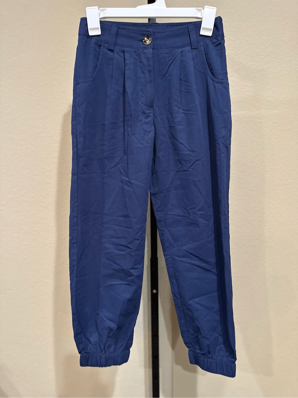 Mid Rise Button Zipper Side Pocket Casual Cotton Joggers in Moonlit Ocean Tag attached Winkles noted Mid waist Back elastic waistband Zipper Two side pockets 100% cotton Fabric does not have any stretch in this style Halara size guide shown in the last image There should be no stains or damage to the garment unless otherwise noted. Original packaging shows signs of handling. Garment may show slight signs of being tried on.