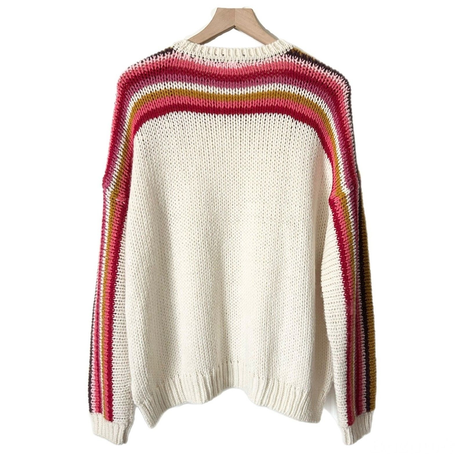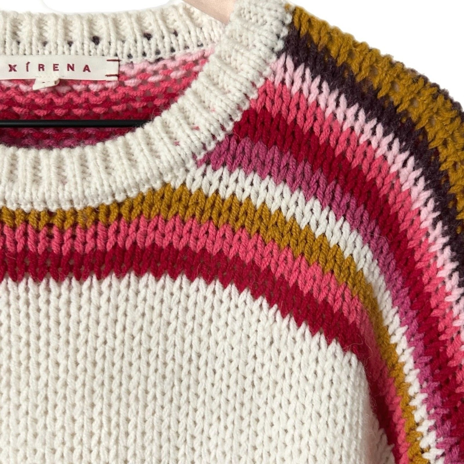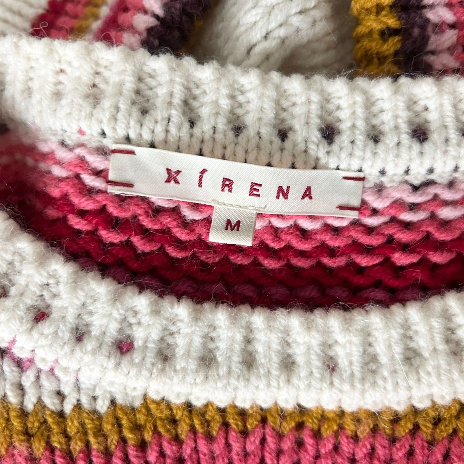 Xirena Apres Ski Sweater in Ketchum Stripe. Excellent used condition with no flaws. Size Medium. Chest - 24.5" Length - 25" Colorful striped detailing on the sleeves and yoke. Crafted from a soft alpaca blend, this crew neck knit features a relaxed fit and ribbed cuffs and hem. Perfect for a cozy day out or a stylish evening gathering. Material: Alpaca, Acrylic Neckline: Crew Neck Features: Oversized, Breathable, Lightweight Pattern: Striped Fabric Type: Knit Knit Style: Chunky-Knit Season: Fall, Spring, Winter Fit: Relaxed Alpaca blend, striped knit, crew neck, pullover, boho chic, cozy, fall fashion, winter wear, casual style, designer knitwear, colorful stripes, weekend outfit SKU 52625